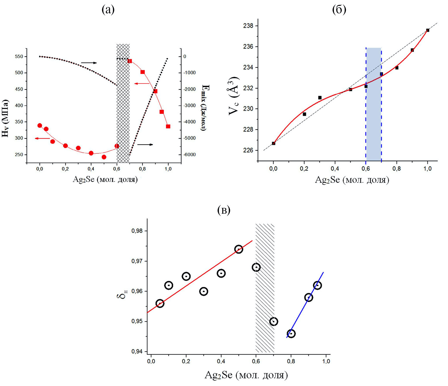 Рис. 2. а – Красные кружки и квадраты – концентрационная зависимость микротвердости для двух областей твердых растворов (наши данные). Пунктирные черные линии – энергия смешения для твердых растворов (I) и (II) при 298 K [5]. Заштрихованная область разделяет твердые растворы на основе Ag2S и твердые растворы на основе Ag2Se. б – Концентрационная зависимость объема элементарной ячейки для двух областей твердых растворов [6]. в – Концентрационная зависимость пластичности по Мильману (наши данные).
