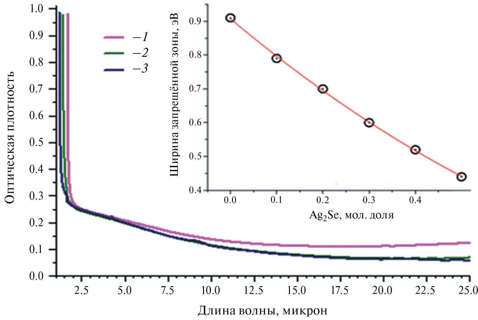 Рис. 3. Обзорный спектр оптического поглощения в ИК диапазоне. 1 – 0.2 Ag2Se, 2 – 0.1 Ag2Se, 3 – 0 Ag2Se. На вставке – концентрационная зависимость оптической ширины запрещенной зоны.