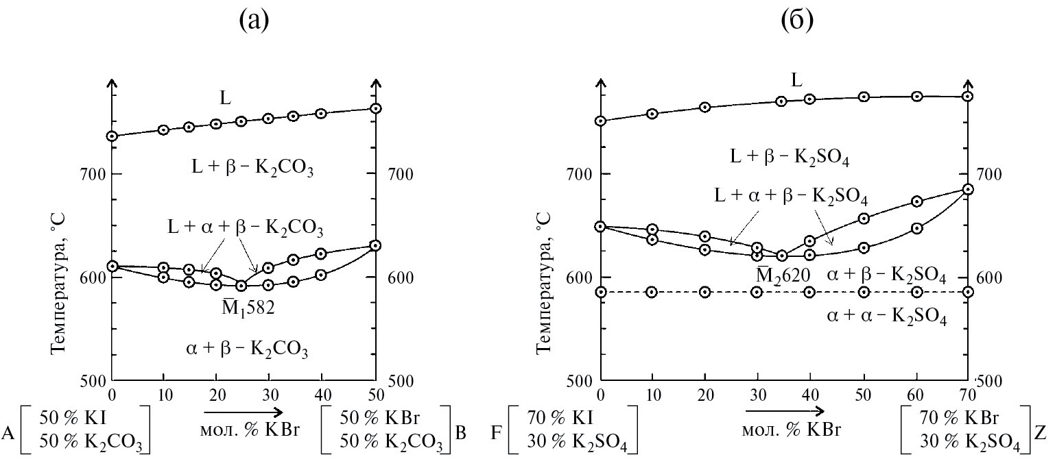 Рис. 4. Политермические разрезы АВ (системы KI-KBr-K2CO3) (а) и FZ(системы KI-KBr-K2SO4)(б).