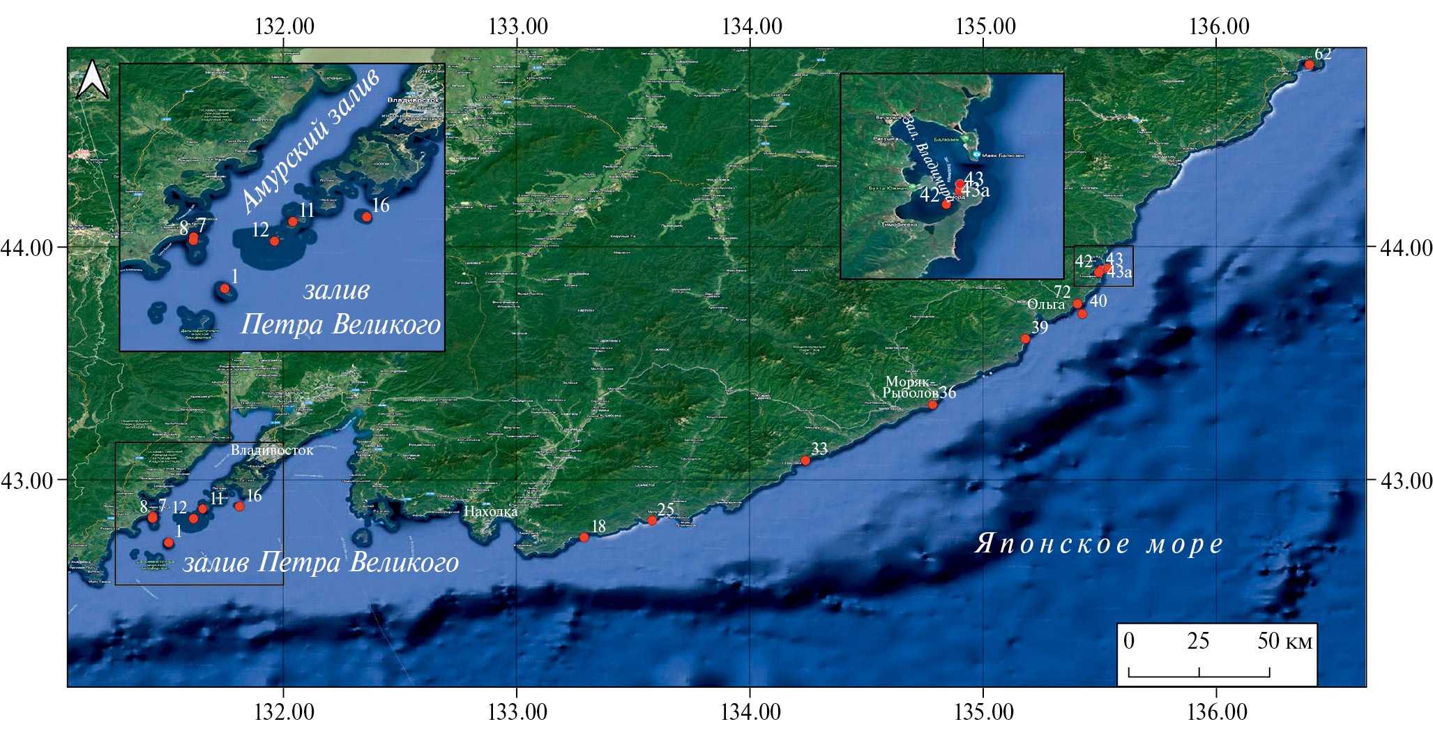 33 | 43°04.971 N, 134°14.283 E | 10 | Крупная галька, песок мелкозернистый |