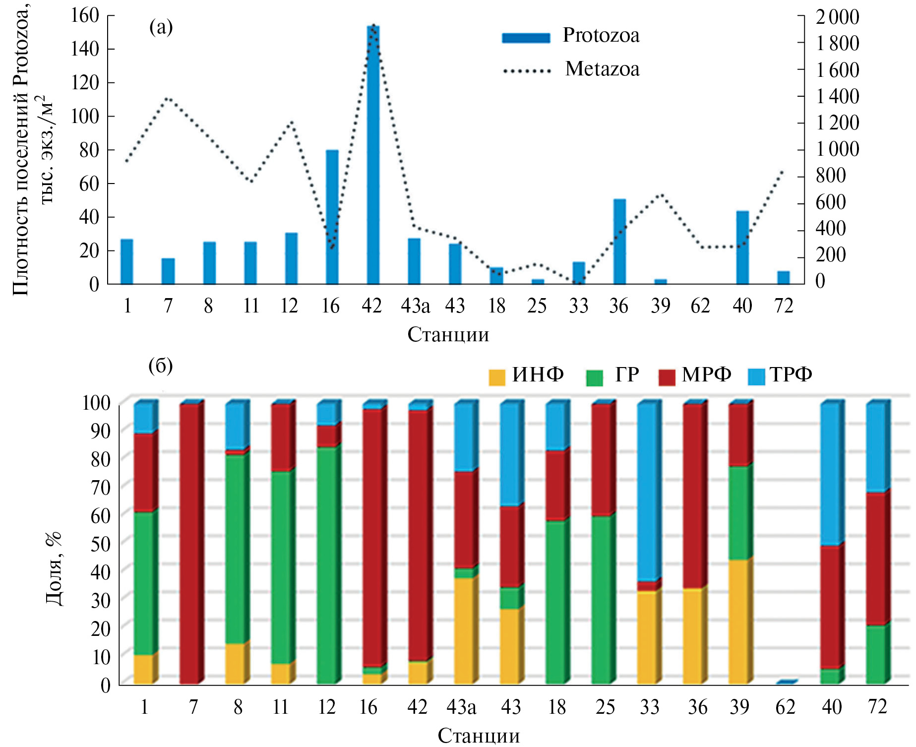Рис. 2. Количественное распределение двух компонентов мейобентоса – Protozoa и Metazoa в Японском море у берегов Приморского края. а – плотность поселения Protozoa и Metazoa; б – соотношение четырех морфоэкологических групп: Ciliophora (ИНФ), Foraminifera с мягкими (МРФ) и с твердыми (ТРФ) раковинами, а также Gromiida (ГР) в таксоценозах простейших на разных станциях