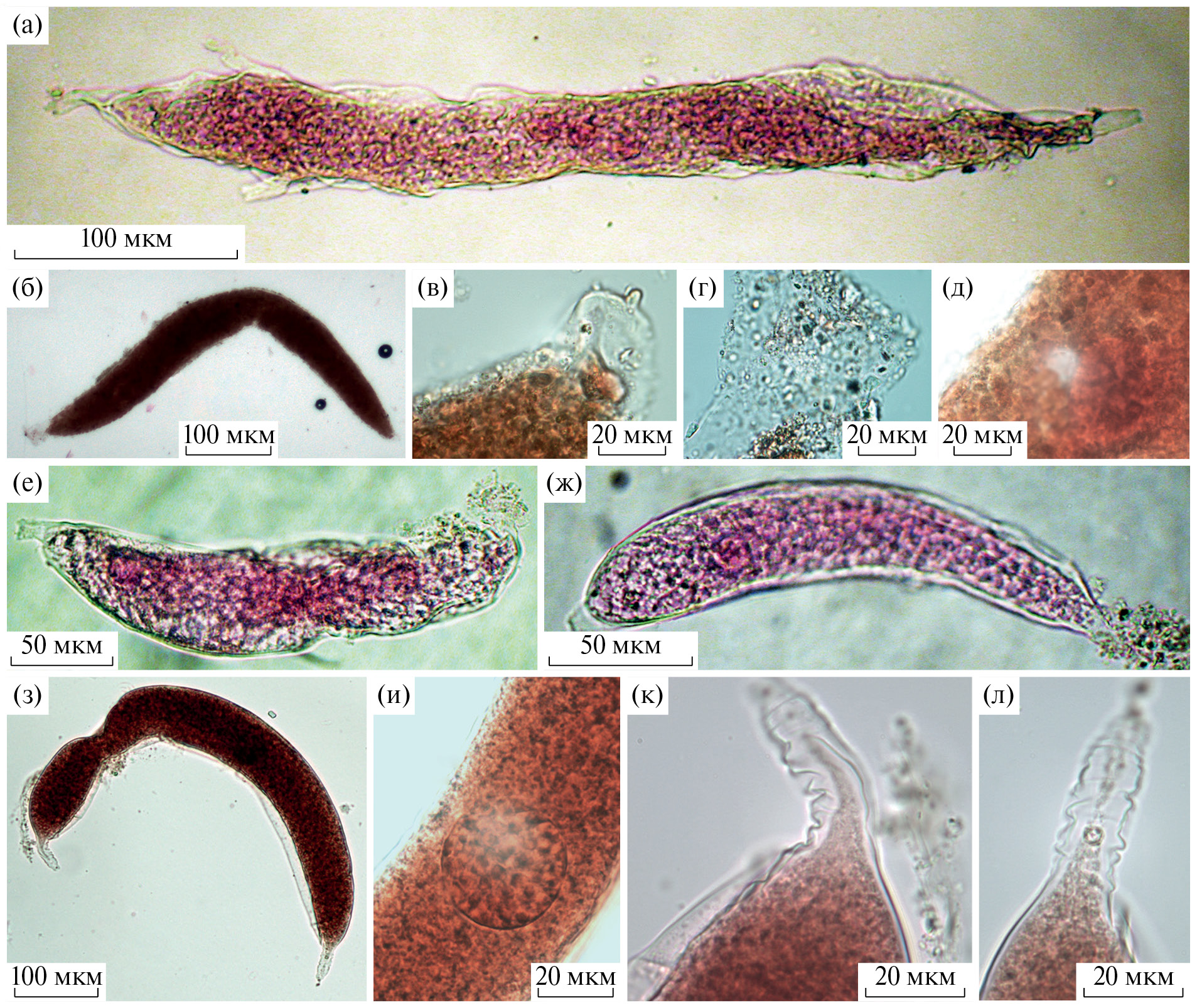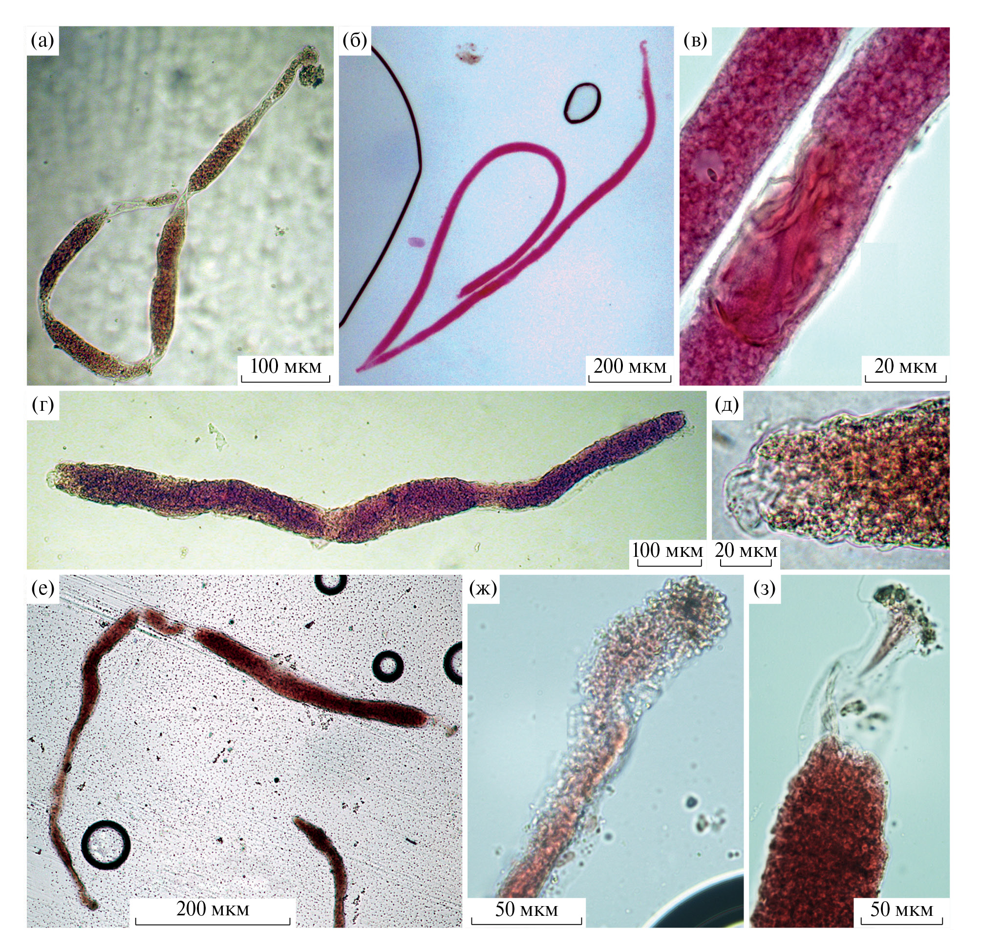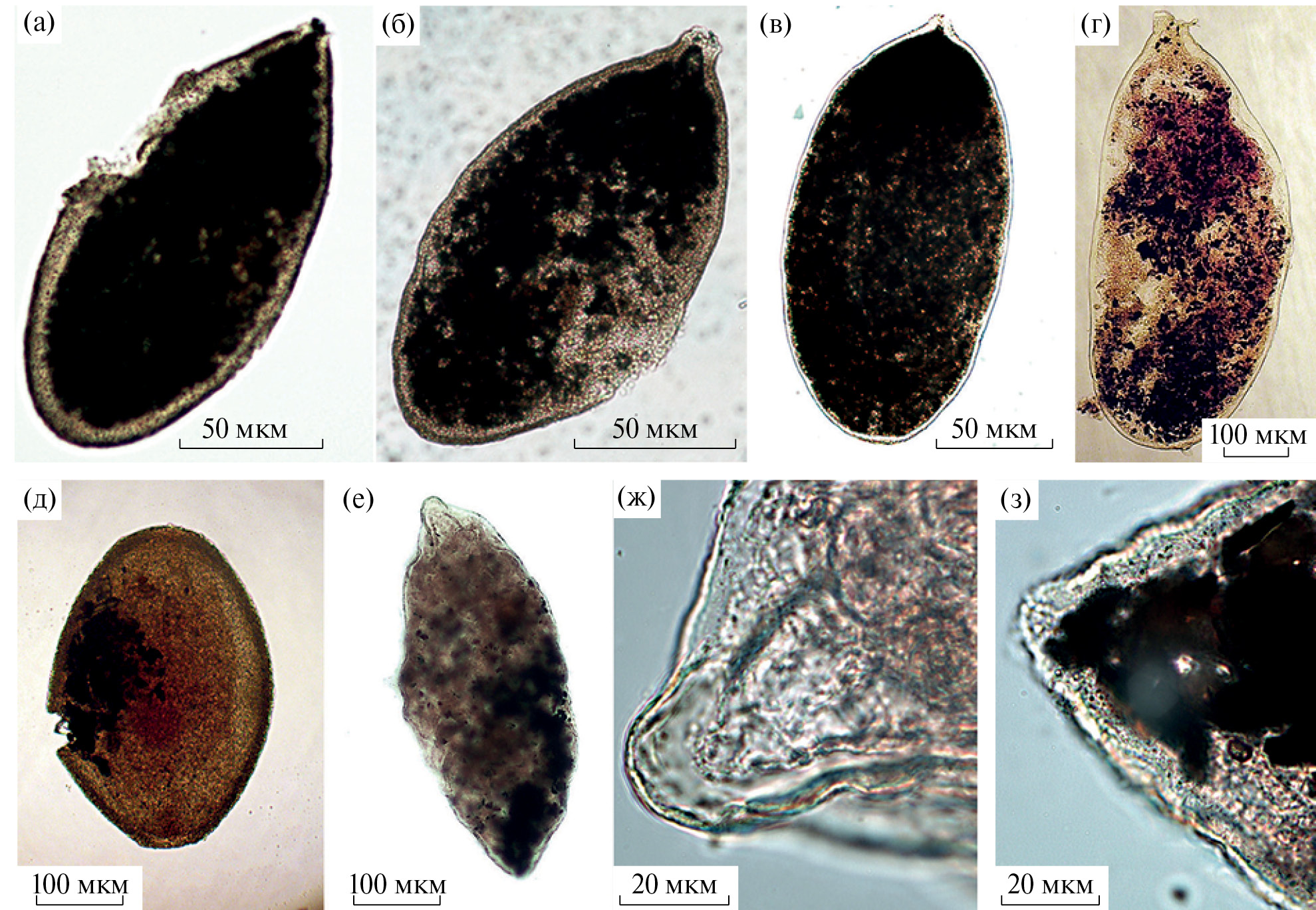 Рис. 3. Представители рода Psammophaga: а–в – Psammophaga cf. simplora; г – Psammophaga sp. 2J; д – Psammophaga sp. 4J; е–з – Psammophaga sp. 3J. е – общий вид, ж – передняя часть особи, содержащая диатомовые водоросли, з – задняя часть особи, заполненная минеральными частицами
