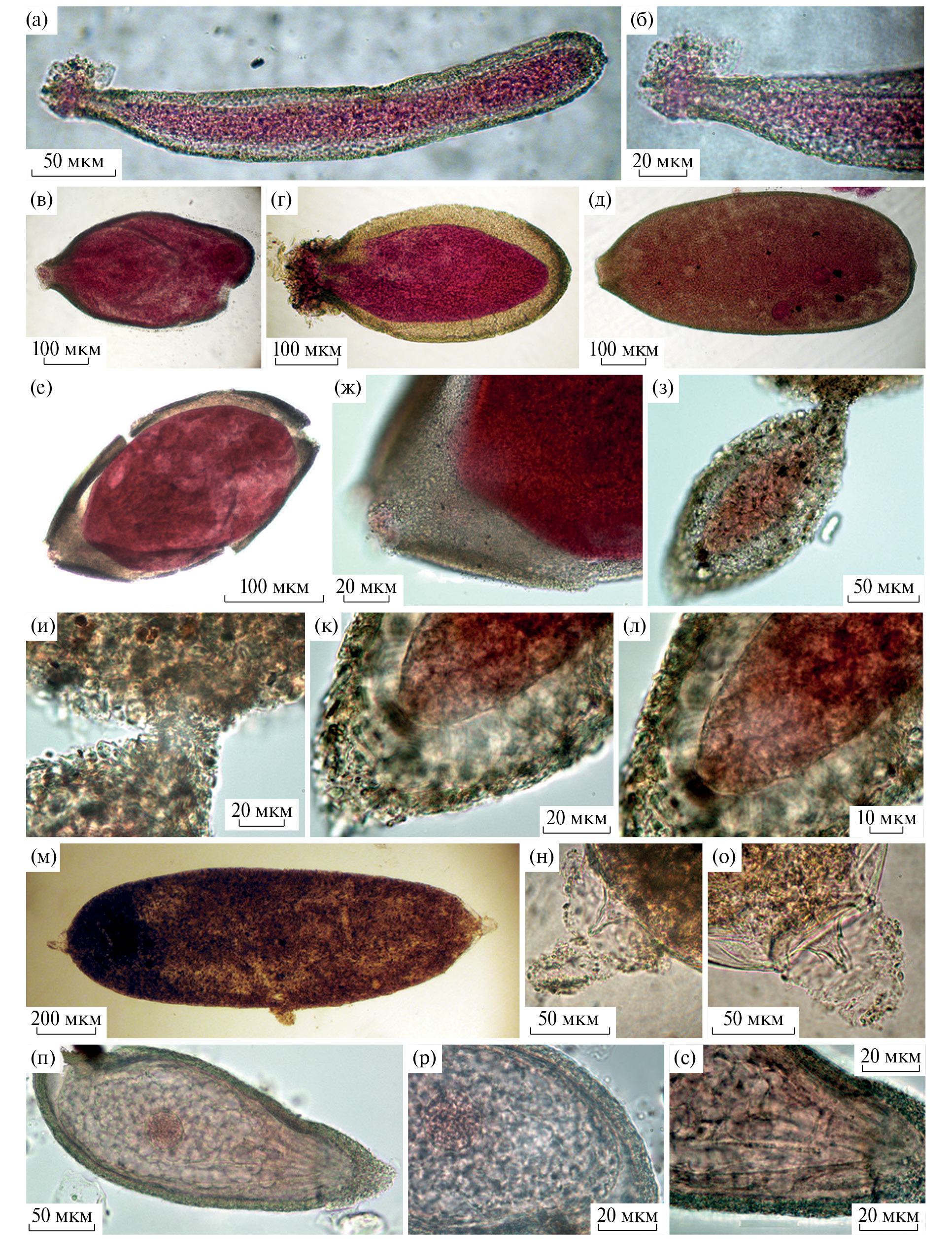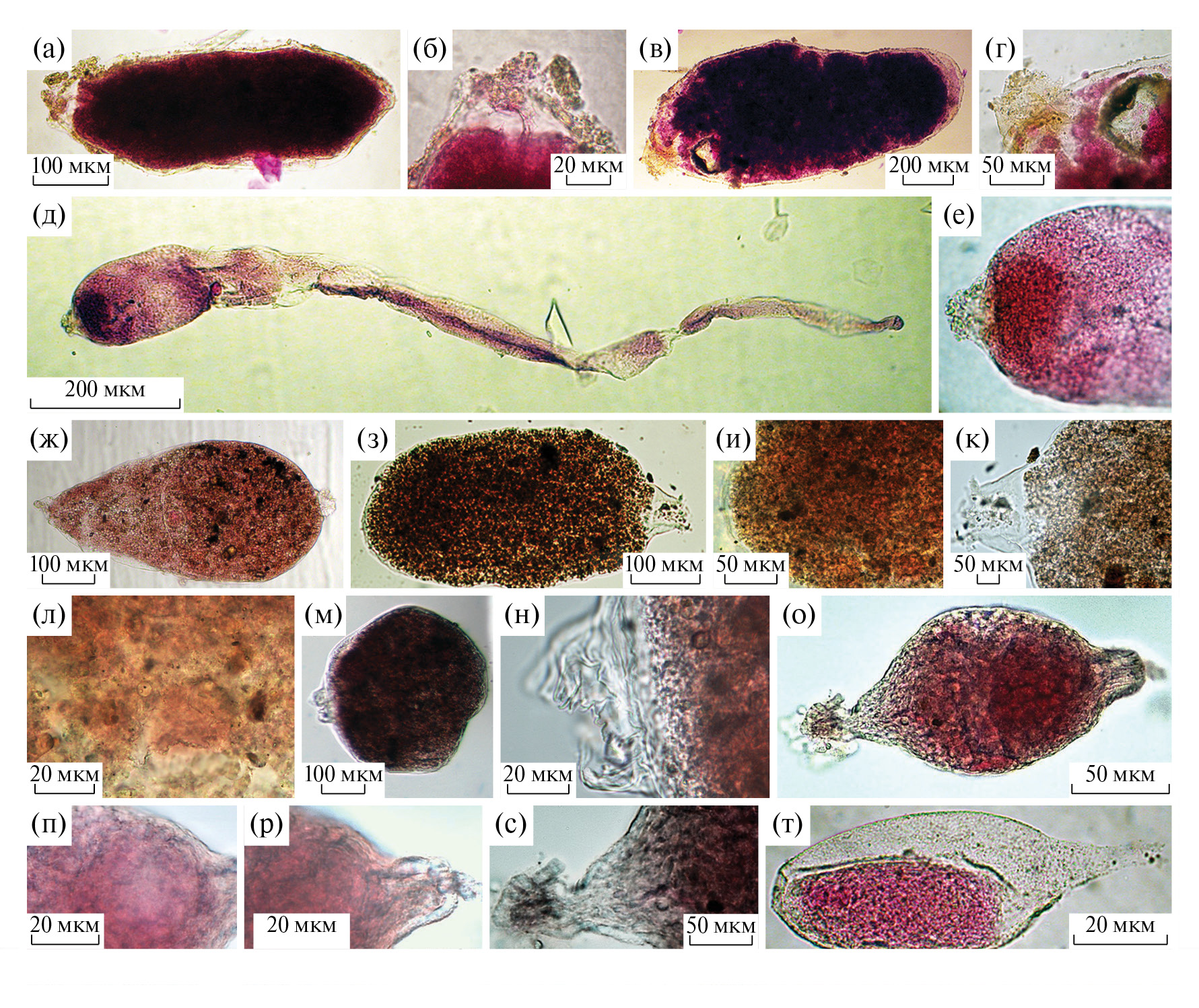Рис. 4. Представители семейства Saccamminidae: а, б – Saccamminid sp. 1J (а – общий вид, б – апертура); в – Saccamminid sp. 2J; г – Saccamminid sp. 3J; д – Saccamminid sp. 4J; е, ж – Saccamminid sp. 5J (е – общий вид, ж – апертура); з–л – Saccamminid sp. 6J (з – общий вид, и – апертура, внедренная в детрит, к – задний край, л – ядро в задней части); м–о – Saccamminid sp. 7 (м – общий вид, н, о – апертуры); п–с – Saccamminid sp. 8J (п – общий вид, р – ядро, с – часть цитоплазмы в районе апертуры)