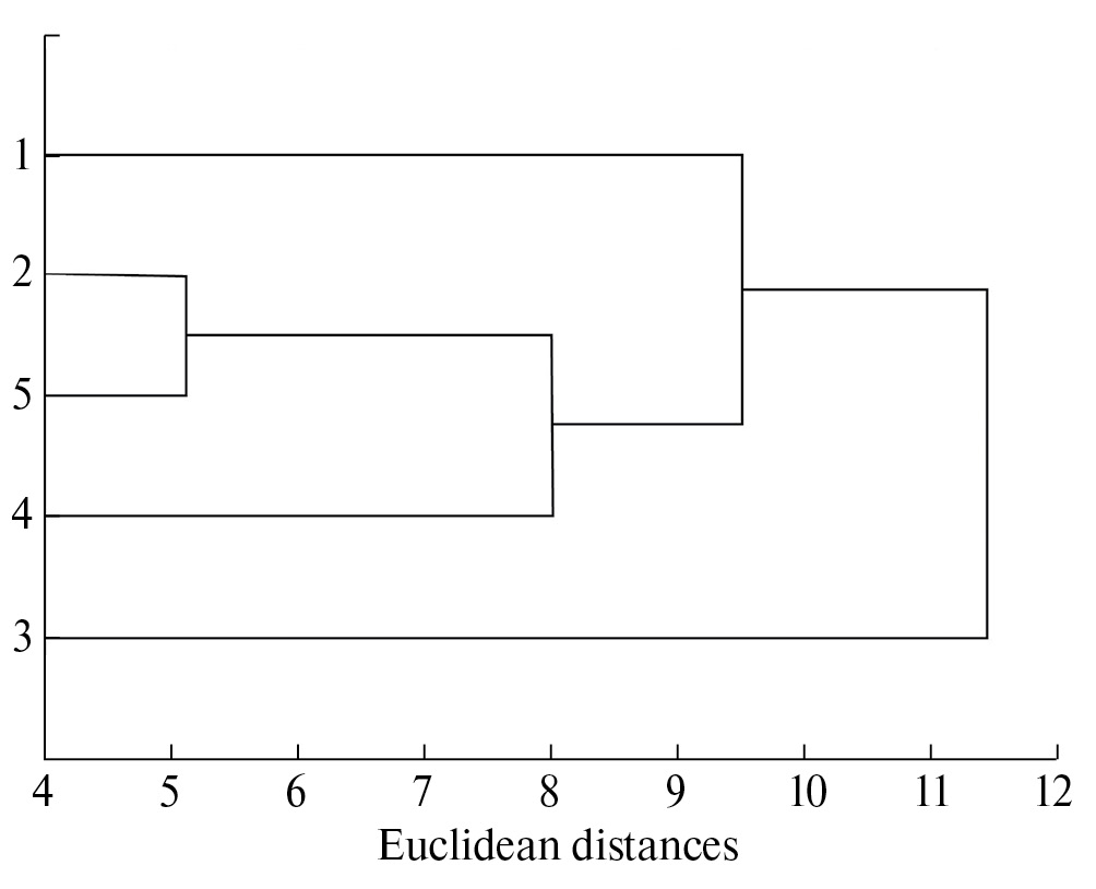 Дендрограмму сходства строили методом полного сцепления. В качестве характеристики различий использовали евклидово расстояние. Была применена статистическая программа Systat 5.0 (Wilkinson et al., 1992a, 1992b).