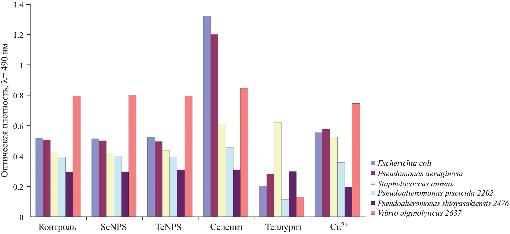 Добавки наночастиц селена и теллура практически не влияли на бактериальный рост, в отличие от добавок селенита и теллурита (рис. 1). Так, добавление селенита приводило к стимулированию роста E. coli, Pseudomonas aeruginosa, S. aureus, Vibrio alginolyticus 2637 и Pseudoalteromonas piscicida 2202, а добавка теллурита подавляла рост E. coli, P. aeruginosa, V. alginolyticus 2637 и P. piscicida 2202. Добавка сульфата меди стимулировала рост всех трех тестовых культур и подавляла рост морских изолятов: P. piscicida 2202, V. alginolyticus 2637 и Pseudoalteromonas shioyasakiensis 2476.