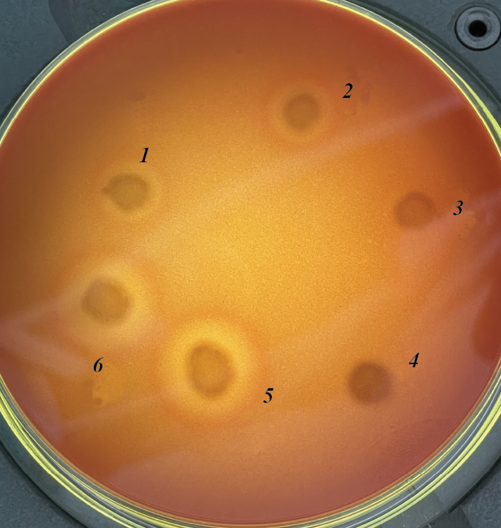 Плотные среды для определения протеазной, амилазной, лецитиназной, липазной активности (чашечный метод) готовили согласно Практикуму (2005), внося в базовую среду соответствующий субстрат. Для определения протеазной активности использовали молочный агар: к 25 г/л агара добавляли 0.5% молоко в соотношении 1 : 2 по объему; агар и молоко стерилизовали отдельно. Бактерии засевали штрихом на поверхность агара, инкубировали в течение суток, затем измеряли зоны просветления вокруг колоний. Лецитиназную активность определяли выращивая бактерии на яично-желтковом агаре в течение 24 ч при 37°С. Непрозрачные зоны измеряли как индикаторы продукции лецитиназы. Липазную активность тестировали на Marine agar 2216 или на LB агаре с добавлением 0.01% СaCl2 × H2O и 1% твин-80, учитывая зоны преципитации. ДНКазную активность определяли на среде DNase test agar (Merck). Гемолитическую активность определяли по стандартной методике (Справочник..., 1982). На 5% кровяной агар засевали суточную бактериальную культуру. После 24 ч инкубации при 35°С учитывали характер гемолиза и величину зоны лизиса эритроцитов в мм.