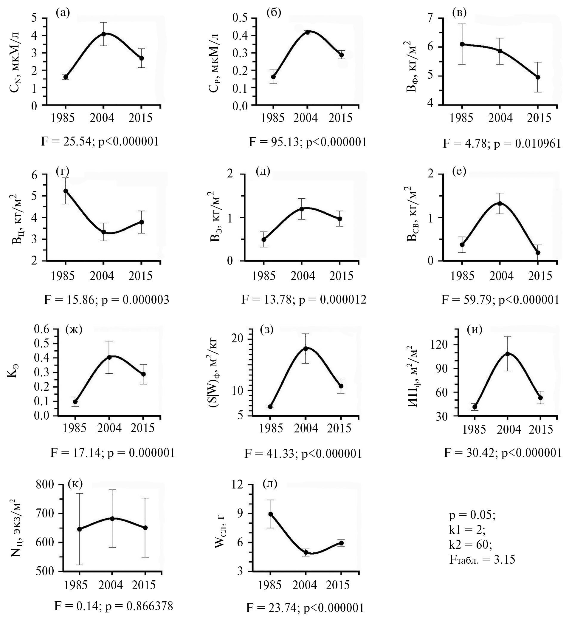 Дисперсионный однофакторный анализ, проведенный для оценки значений переменных в 1985, 2004 и 2015 гг., показал статистически значимые (p ≤ 0.05) межгодовые различия по всем переменным, за исключением плотности популяции цистозиры NЦ (рис. 2к).