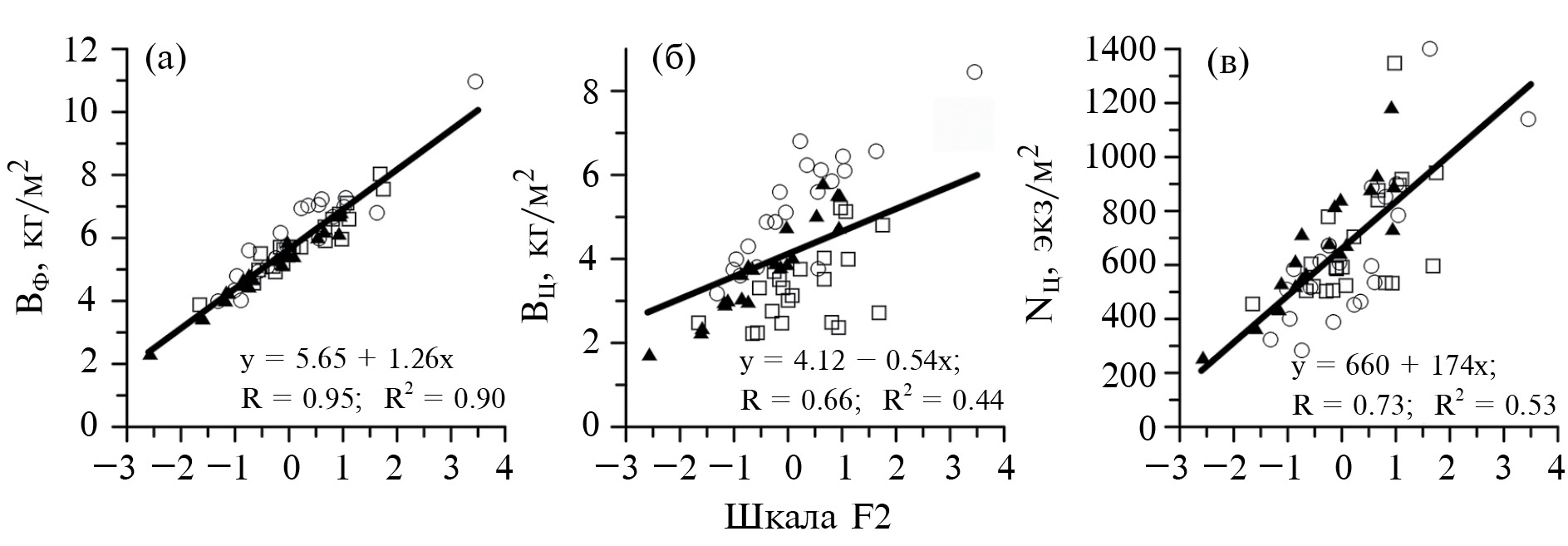 Отсутствие корреляции ВФ с F1 объясняется разнонаправленностью изменения параметров, формирующих биомассу фитоценоза. Так, с увеличением биогенной нагрузки BЦ снижается (рис. 4в), а BЭ и BСВ, наоборот, увеличиваются (рис. 4г и 4д).