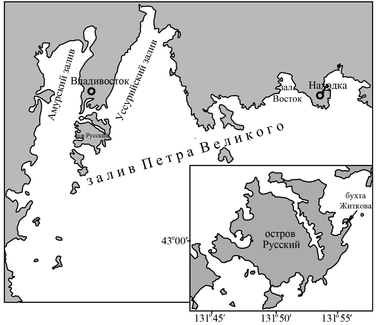 Объектом исследования послужил рак-отшельник Pagurus middendorffii. Сбор материала проводили с ноября 2022 г. по декабрь 2023 г. в б. Житкова (о-в Русский, зал. Петра Великого, Японское море), в биотопе, типичном для обитания этого вида (Кобякова, 1967; Волвенко, 1995), тотально на нескольких участках площадью 2–3 га, в диапазоне глубин 1–3 м (рис. 1). Отлов животных производили сотрудники водолазного отдела ННЦМБ ДВО РАН. Пробы брали 1–2 раза в месяц, в мае отбор проб проводили трижды, чтобы не пропустить предполагаемый повторный нерест. Всего отловлено и просмотрено 1303 экз. P. middendorffii (табл. 1).