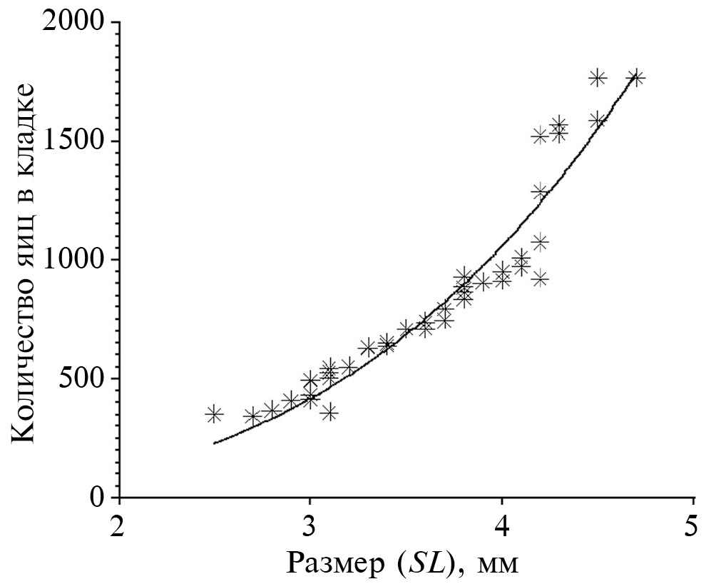 Индивидуальная плодовитость самок с SL от 2.5 до 4.7 мм изменялась соответственно от 343 до 1767 экз. и в среднем составила 836±400 экз. (рис. 4). Зависимость ИП самок от размера тела хорошо аппроксимируется степенным уравнением вида: F = 19.9867∙SL2.8461 (стандартная ошибка линейного коэффициента равна 1.4411, степенного – 0.1236; коэффициент детерминации 93.1%; объем выборки 41 экз.).