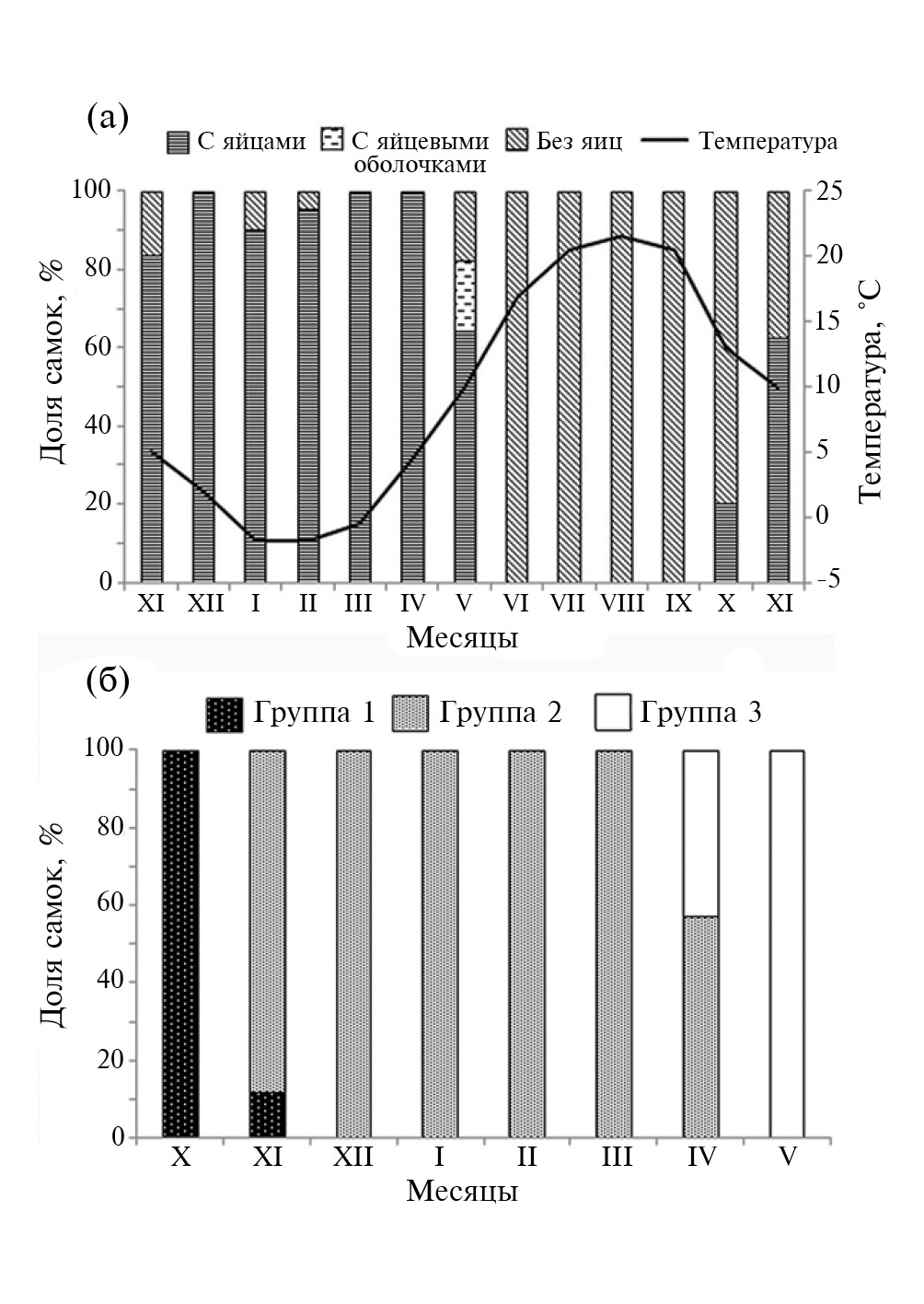 Яйценосные самки группы 1 появились во второй половине октября (табл. 1; рис. 5), яйца в кладках находились на начальных стадиях развития и были равномерно заполнены желтком. В ноябре доля яйценосных самок увеличивалась, в первых числах ноября встречались недавно отнерестившиеся самки группы 1 и самки группы 2, в яйцах которых появилось небольшое свободное от желтка пространство, свидетельствующее о начале формирования зародышевого диска. В конце ноября зародышевый диск у эмбрионов виден в кладках всех самок (группа 2). В январе–феврале большая часть яйца все еще заполнена желтком, но пространство, свободное от желтка увеличилось, к концу марта оно занимало около 50% объема яйца. У единичных самок без яиц (SL 2.5 и 2.8 мм), обнаруженных в январе и феврале (рис. 5а), гонады не видны через покровы плеона. На протяжении апреля количество желтка у эмбрионов в кладках продолжало уменьшаться. Во второй половине апреля отмечены самки группы 3, у вынашиваемых ими эмбрионов появился неоформленный темный глазной пигмент, желток занимал менее ¼ объема яйца. У одной из яйценосных самок (SL 4.9 мм) вся кладка была представлена абортивными яйцами, утратившими темную окраску. В мае все яйценосные самки входили в группу 3. К началу мая глазной пигмент приобрел форму полумесяца, у эмбрионов сформированы плеон и максиллипеды, на головогруди появились красные хроматофоры; незначительное количество желтка присутствовало в дорсальной части эмбриона. В середине мая эмбрионы полностью сформировались, глазной пигмент приобрел овальную форму. В это же время появились завершившие инкубацию самки с пустыми яйцевыми оболочками на плеоподах. В конце мая встречались только недавно выпустившие личинок самки с яйцевыми оболочками на плеоподах и самки без яиц. Наблюдение за состоянием гонад самок в мае не выявило особей, готовых к повторному нересту.