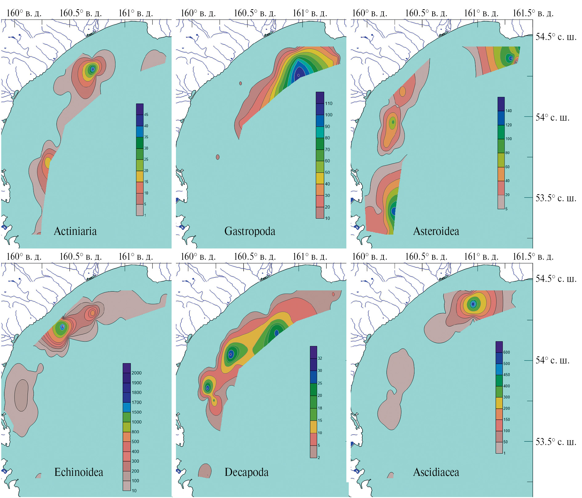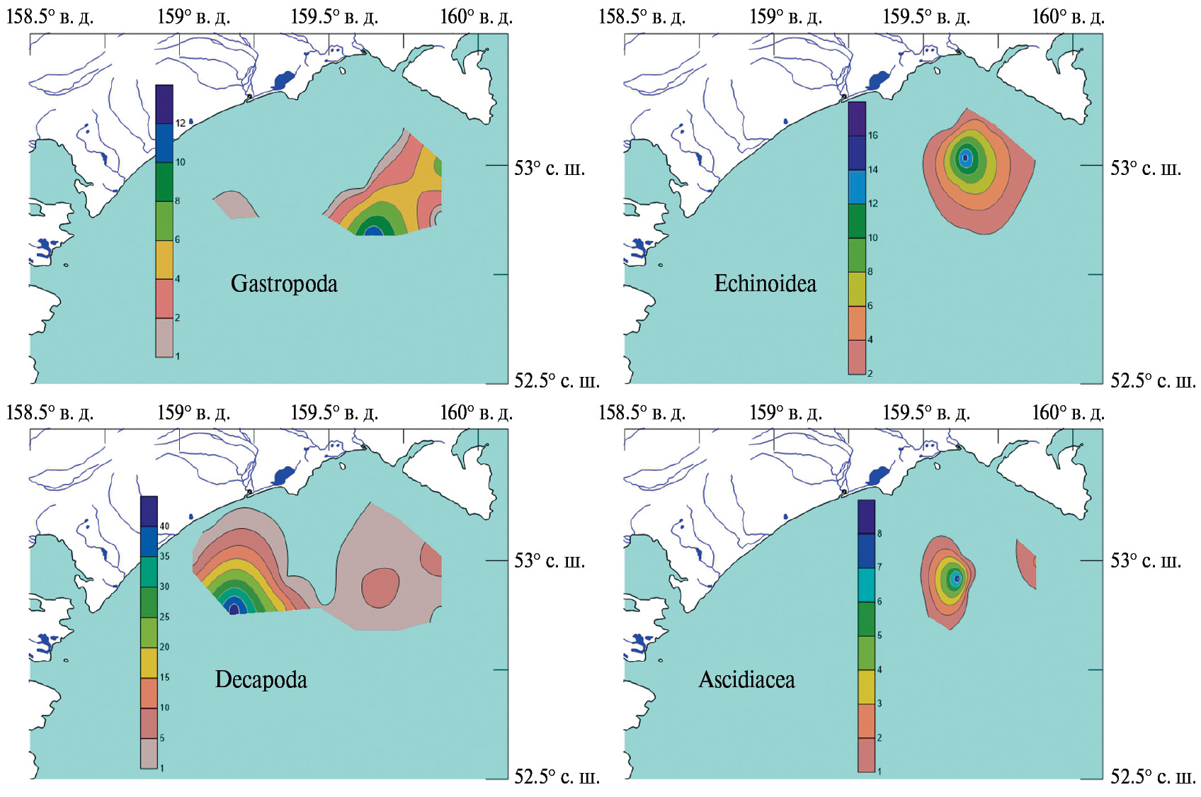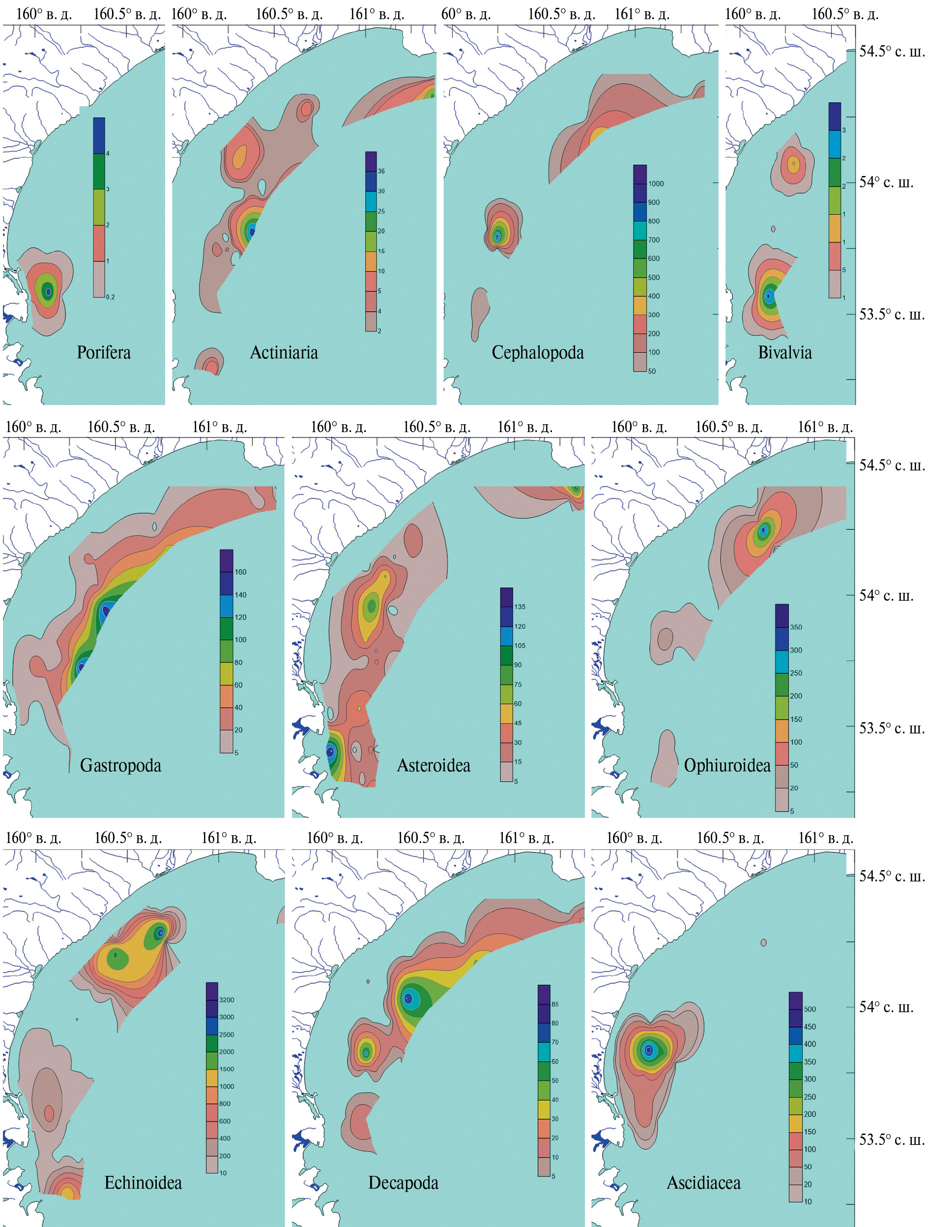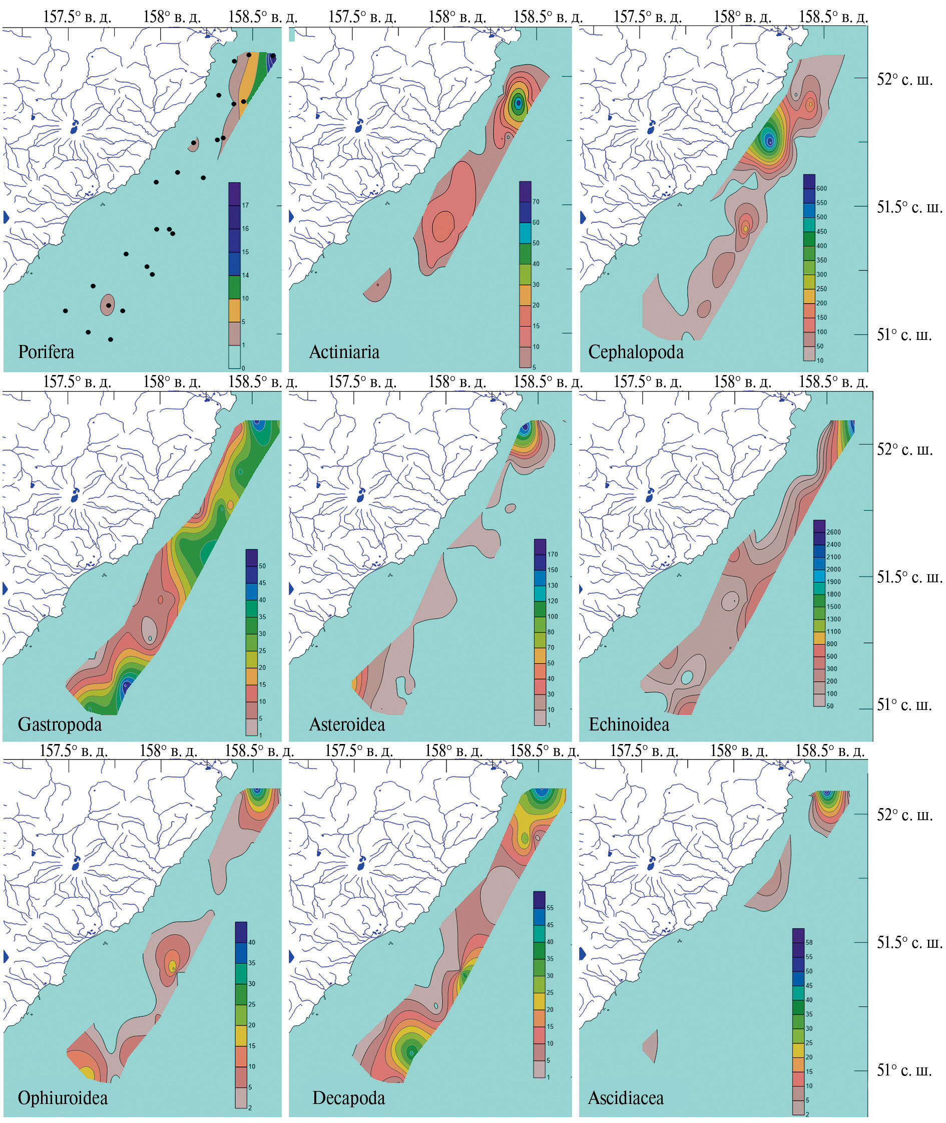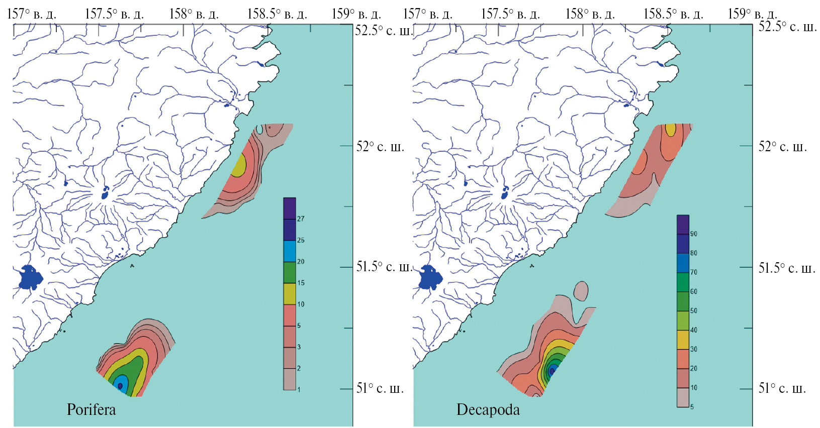 Средняя и максимальная плотность поселения (экз./км2) в 2022 г. сильно сократились (от полутора–двух раз до нескольких порядков) во всех группах, кроме Porifera и Decapoda на шельфе юго-восточного побережья Камчатки южнее мыса Поворотный (рис. 9). Там же отмечено увеличение в 1.5 раза максимальной плотности поселения Ascidiacea, а на шельфе Кроноцкого залива – увеличение в 2 раза максимальной плотности поселения Bivalvia (табл. 1, 2).
