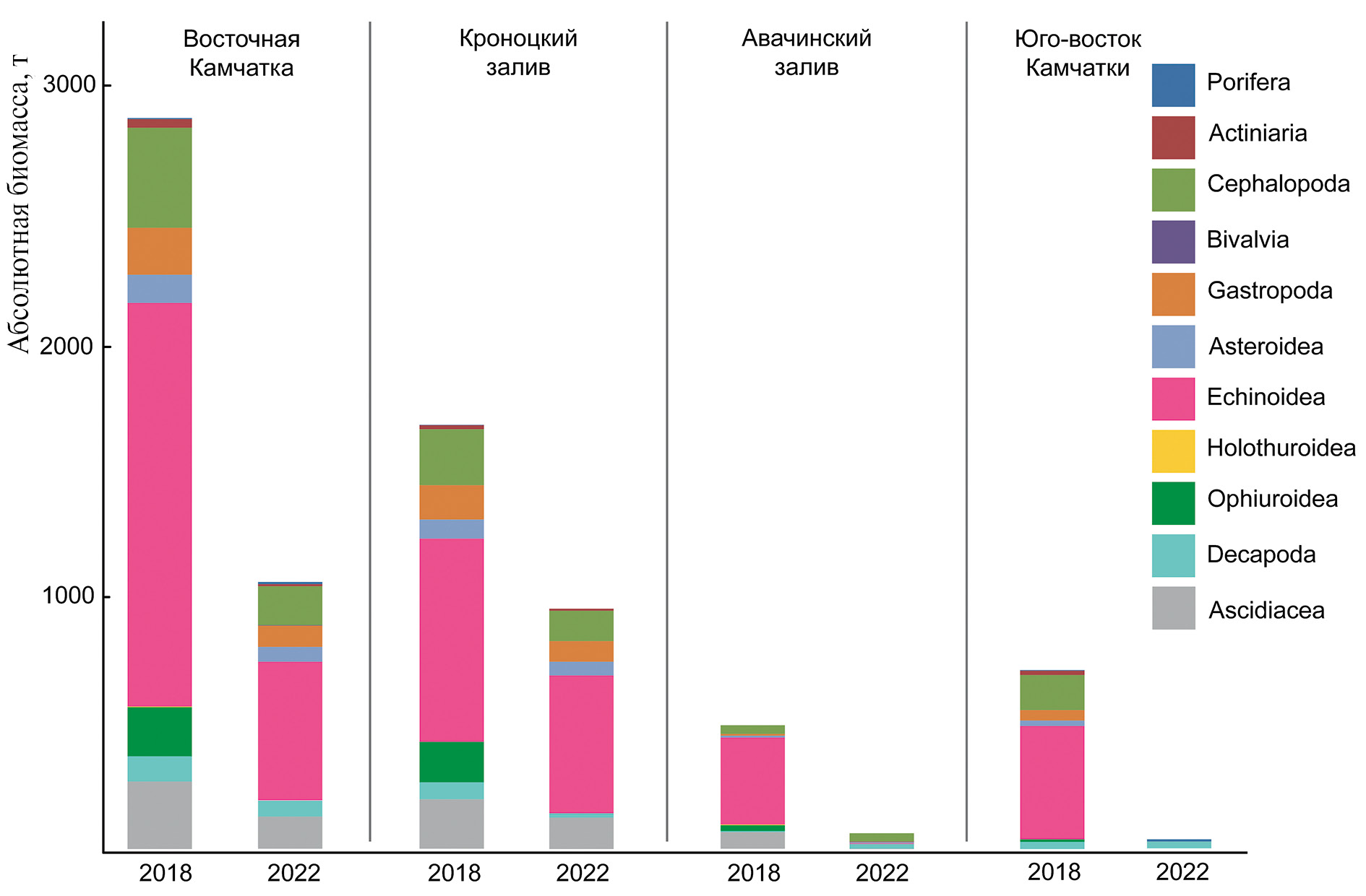 Рис. 8. Абсолютная биомасса групп беспозвоночных, учтенных в приловах донных траловых съемок в 2018 и 2022 гг.