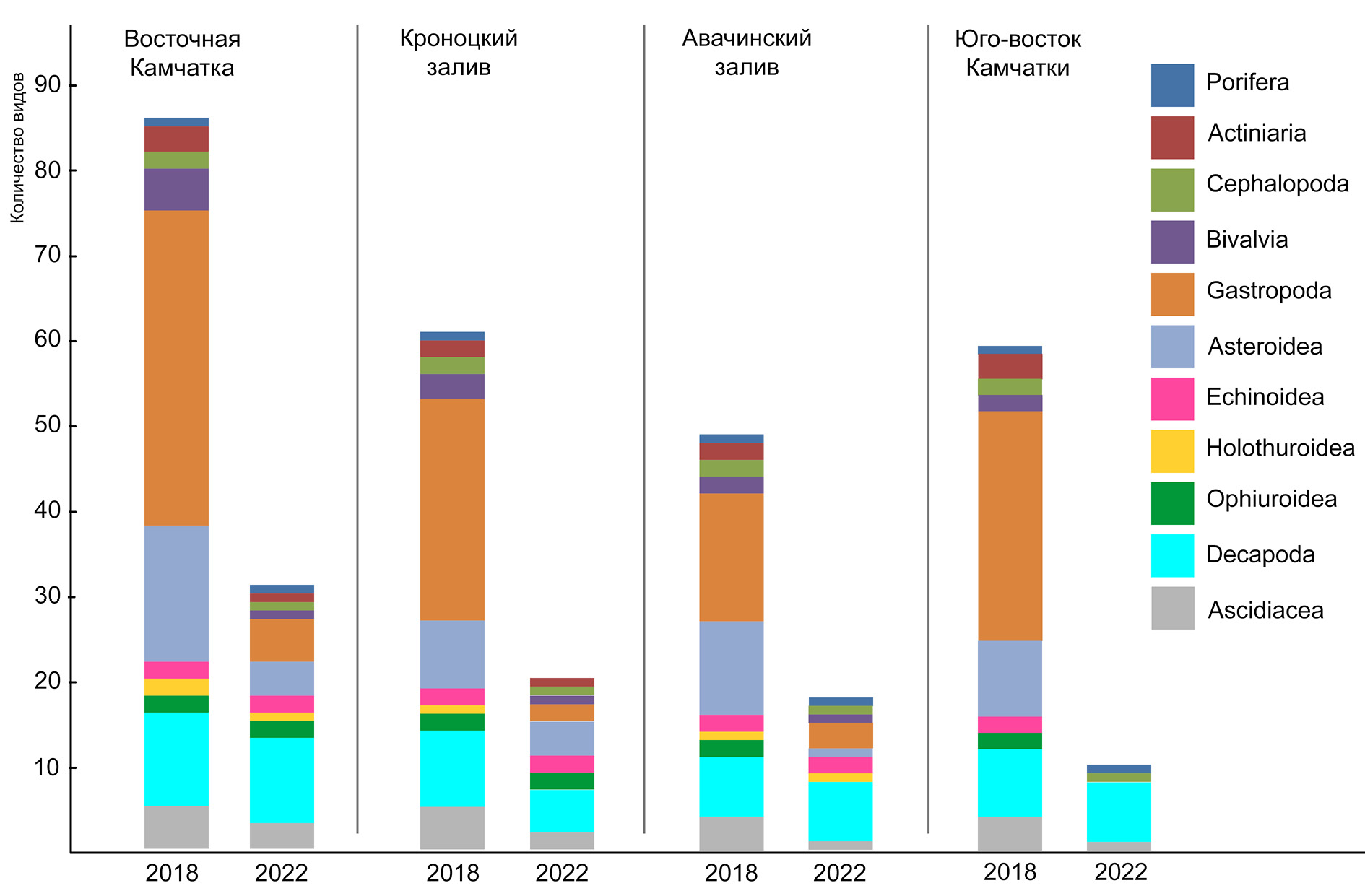 Практически полностью в 2022 г. исчезли в уловах голотурии и офиуры (за исключением одного мелкого экземпляра Cucumaria sp. и двух очень мелких молодых экземпляров офиур, масса которых отдельно не учитывалась). Из остальных групп наиболее значительное сокращение абсолютной биомассы отмечено у актиний (в 3.7 раза) и морских ежей (в 2.9 раза). Более чем в два раза сократилась абсолютная биомасса головоногих (в 2.6 раза) и брюхоногих (в 2.2 раза) моллюсков, а также асцидий (в 2.1 раза). Почти вдвое сократилась абсолютная биомасса морских звезд (в 1.9 раза). Наименьшее сокращение (в 1.6 раза) отмечено для декапод (за исключением промысловых крабов и крабоидов). Абсолютная биомасса губок в целом показала увеличение (в 2.2 раза) только за счет трехкратного роста их количества в приловах в самом южном районе – у юго-восточного побережья Камчатки южнее мыса Поворотный. В то же время в соседнем районе, на шельфе Авачинского залива, абсолютная биомасса губок сократилась в 1.7 раза, а на шельфе Кроноцкого залива в 2022 г. губки вовсе не были обнаружены. Актинии полностью исчезли в приловах в Авачинском заливе и до южной оконечности Камчатки, на шельфе Кроноцкого залива их биомасса сократилась в 1.8 раза (на 43.5%). Абсолютная биомасса головоногих моллюсков в 2022 г. по сравнению с данными 2018 г. практически не изменилась в Авачинском заливе, уменьшилась в 1.84 раза (на 47.5%) в Кроноцком заливе и катастрофически сократилась на шельфе юго-восточного побережья Камчатки южнее мыса Поворотный – в 486 раз (на 99.8%). Абсолютную биомассу двустворчатых моллюсков не подсчитывали. Абсолютная биомасса брюхоногих моллюсков в Кроноцком заливе в 2022 г. сократилась по сравнению с 2018 г. в 1.66 раза (почти на 40%), в Авачинском заливе – в 4.5 раза (на 77.5%), а на шельфе юго-восточного побережья Камчатки южнее мыса Поворотный эта группа исчезла полностью. Аналогичная ситуация была с морскими звездами и морскими ежами: в Кроноцком заливе абсолютная биомасса морских звезд сократилась в 1.4 раза (на 27%) и морских ежей – в 1.5 раза (на 32%), в Авачинском заливе – в 3.4 раза (на 70.6%) и в 127.4 раза (на 99.2%), соответственно. У юго-восточного побережья Камчатки южнее мыса Поворотный иглокожие в приловах в 2022 г. исчезли полностью. Фауна асцидий больше всего пострадала в Авачинском заливе, где абсолютная биомасса этой группы уменьшилась в 45 раз (на 97.8%), у юго-восточного побережья Камчатки южнее мыса Поворотный – в 11 раз (на 91%), в Кроноцком заливе – в 1.6 раза (на 36%). По ракообразным, представленным в приловах десятиногими ракообразными (исключая промысловых крабов и крабоидов, которых мы здесь не учитываем), картина была совсем другая: в Авачинском заливе абсолютная биомасса увеличилась в 5 раз (на 400%), у юго-восточного побережья Камчатки южнее мыса Поворотный она почти не изменилась, а в Кроноцком заливе уменьшилась почти в 4 раза (на 74%). Доля Decapoda в средней биомассе в 2022 г. увеличилась на всех трех участках, но наиболее значительно – на шельфе юго-восточного побережья Камчатки южнее мыса Поворотный (в 19 раз) и Авачинского залива (в 11 раз), в меньшей степени – на шельфе Кроноцкого залива (в 1.5 раза).
