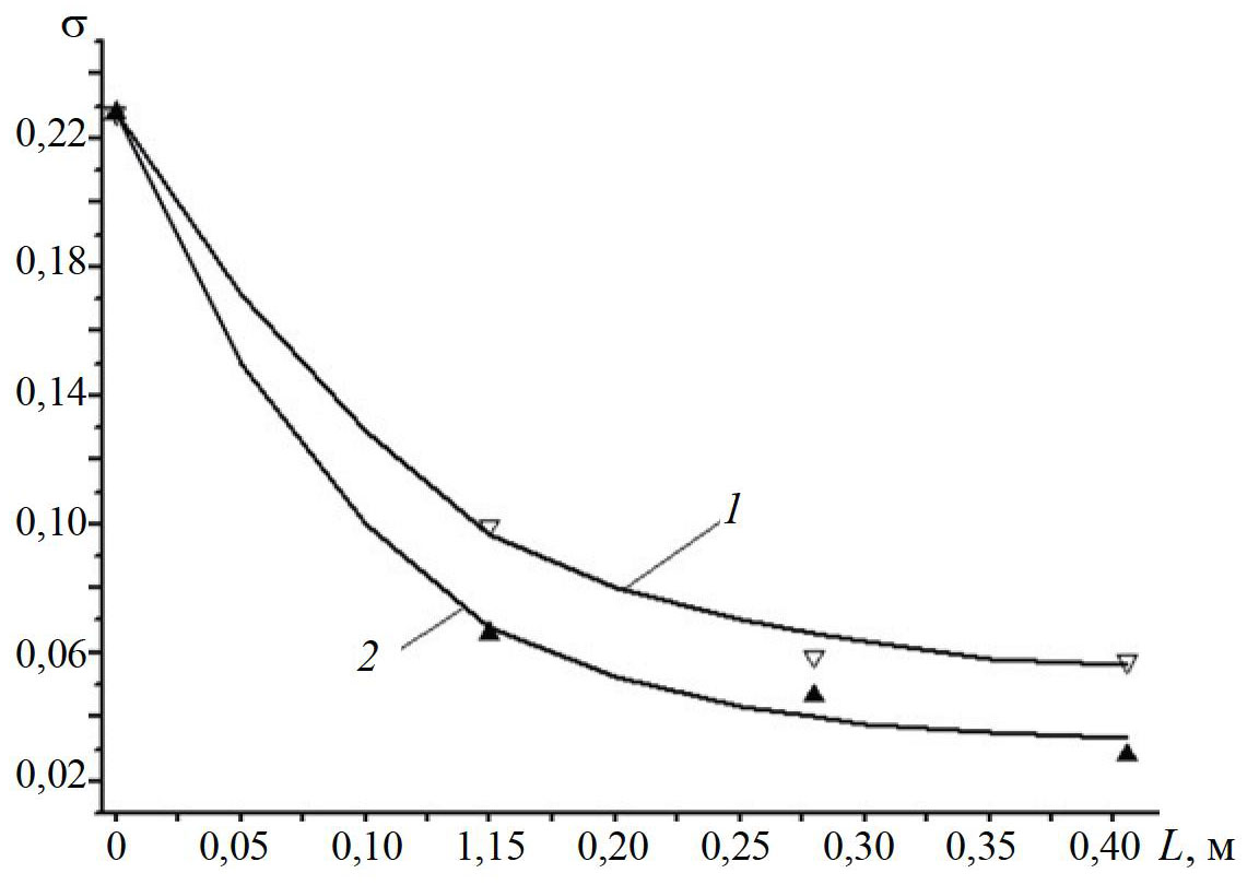 Рис. 2. Зависимость сглаживающей способности смесителя от расстояния до точки загрузки при различных углах наклона лопастей α: 1 – α = 90°, σ = 0,18exp(–L/0,11) + 0,05; 2 – α = 45°, σ = 0,19exp(–L/0,09) + 0,03 (значки – экспериментальные точки, линии – аппроксимирующие функции)