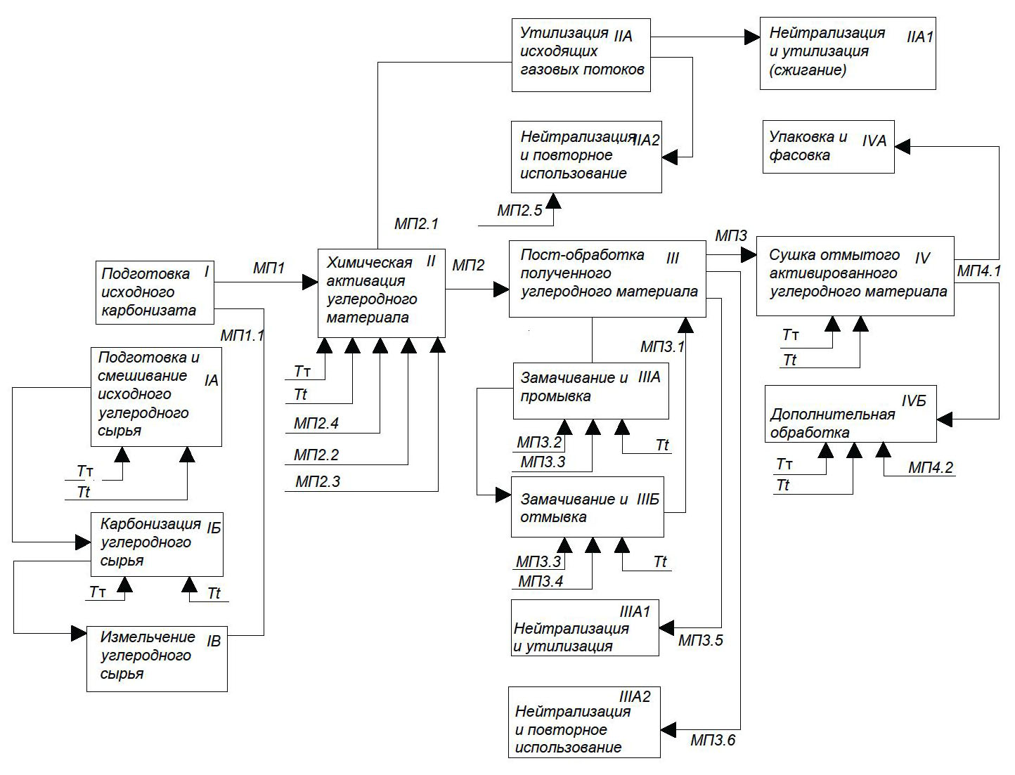 Технология высокотемпературной активации углеродного материала состоит из четырех уровней с соответствующей декомпозицией.