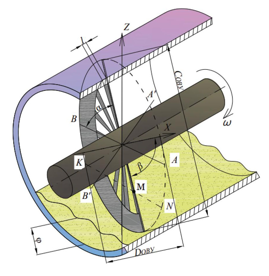 Для расчета значений используем схему, показанную на рис. 1). Геометрический профиль ОВУ для упрощения расчетов можно представить в виде части эллипсного контура, ограниченного образующей АB, наклоненной под углом β к его малой оси. При этом устройство наклонено к горизонтальной оси камеры смешения под углом a. Расстояние от образующей до горизонтальной оси камеры смешения равно l, коэффициент загрузки материалом – j. Угол поворота устройства обозначим через ξ, диаметр устройства – DОВУ, радиус – RОВУ