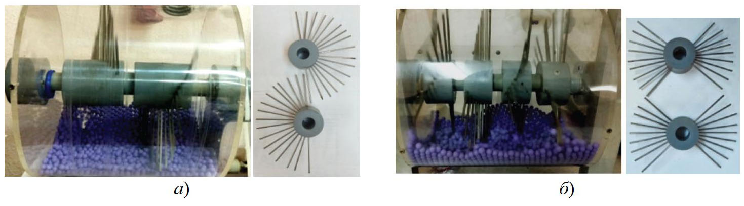 Для изучения процесса гомогенизации смеси одно- и двухзаходными винтовыми устройствами (ДВУ) проведено моделирование процесса смешения в периодическом режиме работы с использованием вышеуказанных устройств (рис. 2). Для изменения энергосилового воздействия рабочих органов (винтовых устройств) на их поверхности установлены сплошные пластины с различной площадью контакта в период погружения в слой материала.