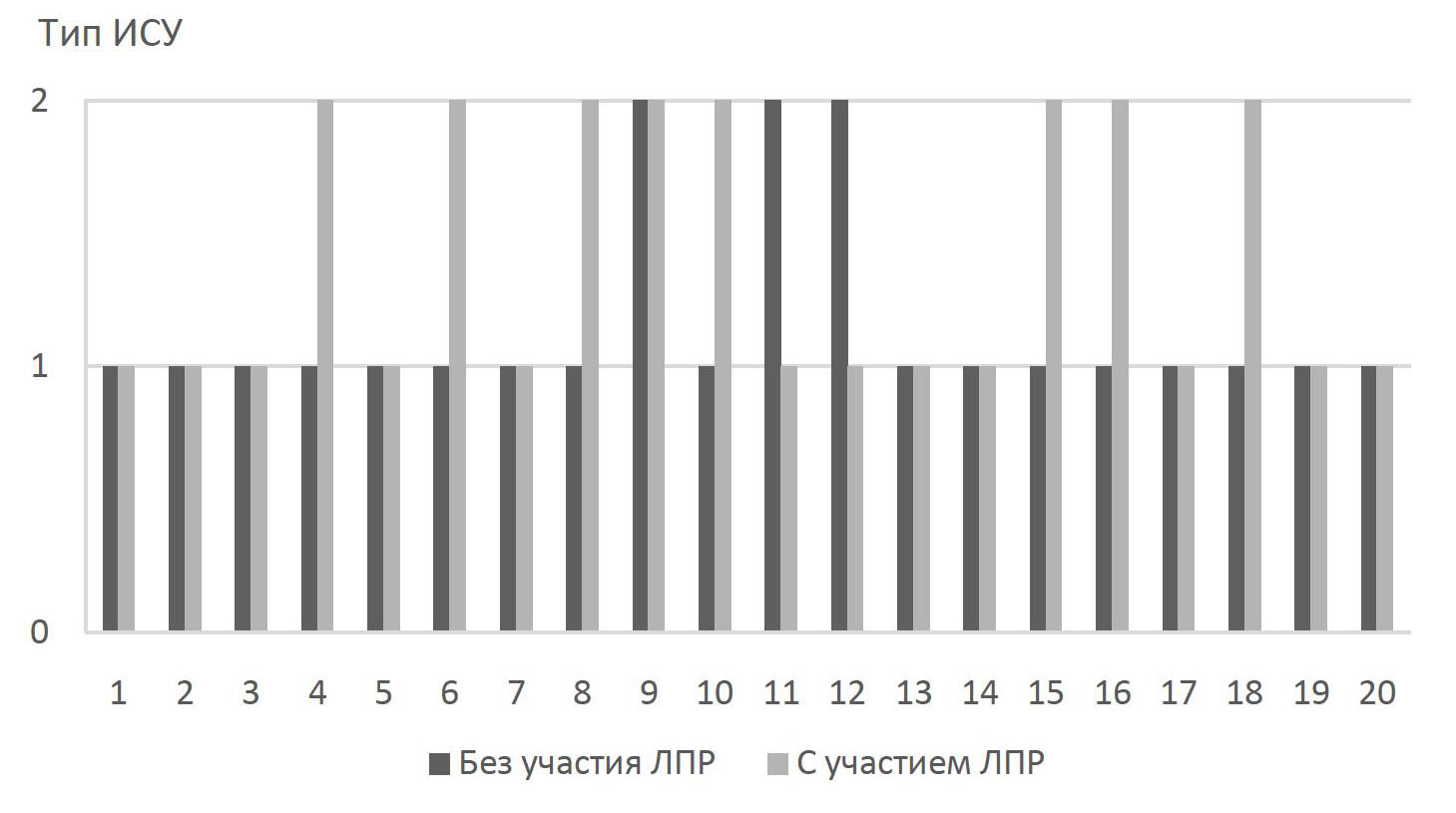 На рисунке 4 представлены результаты выбора типа ИСУ, которые настроены как с участием ЛПР, так и без него, в рамках проведенных экспериментов по двум категориям: 1 – АП; 2 – НЛВ.