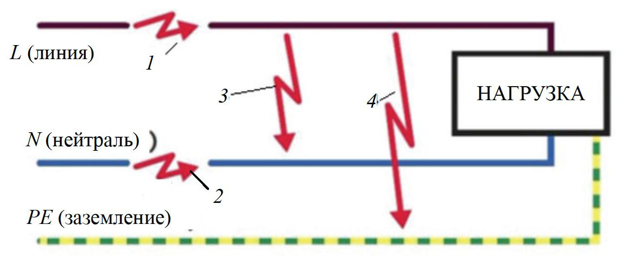Рис. 1. Виды повреждений в электрических сетях до 1 кВ: 1, 2 – последовательный дуговой пробой «плохой контакт»; 3 – параллельный дуговой пробой; 4 – параллельный дуговой пробой на землю