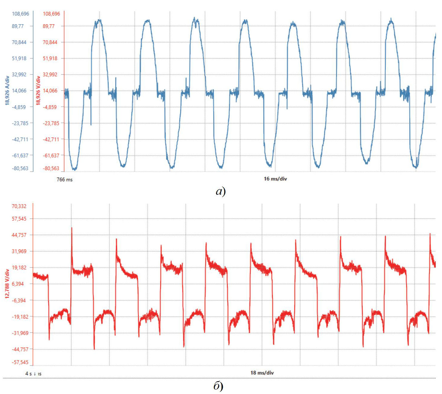 Рис. 3. Осциллограммы тока в искровом промежутке (а) и напряжения генератора дуги (б)