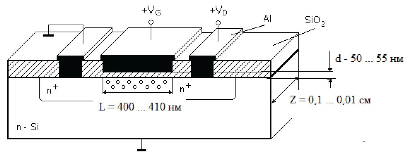 где ID – ток стока ПИП, А; Z , L – ширина и длина канала ПИП соответственно, см; VSD – напряжение между истоком и стоком, В; – подвижность основных носителей заряда электронов; VG , VD – напряжения на затворе и стоке соответственно, В; k – постоянная Больцмана, Дж/K; T – температура, K; e – заряд электрона, Кл; ND – концентрация донорных атомов, см–2; – абсолютная диэлектрическая проницаемость; – относительная диэлектрическая проницаемость подзатворного диэлектрика, Ф/см; d – толщина подзатворного диэлектрика, см; EG(0) = 1,17 эВ – ширина запрещенной зоны полупроводника, экстраполированная к T = 0 K.