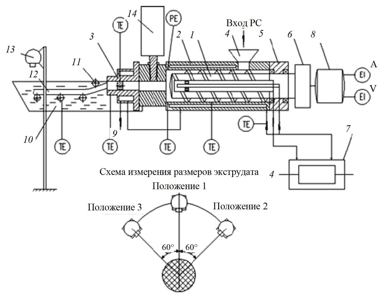 1 – шнек; 2 – цилиндр; 3 – формующая головка; 4 – загрузочное устройство; 5 – опора шнека; 6 – редуктор; 7 – термостат; 8 – электродвигатель; 9 – дорнодержатель; 10 – ванна с теплоносителем; 11 – прижимные ролики; 12 – экструдат; 13 – цифровая фотокамера; 14 – ультразвуковой излучатель; TE – датчики температуры; PE – датчик давления; A – амперметр; V – вольтметр