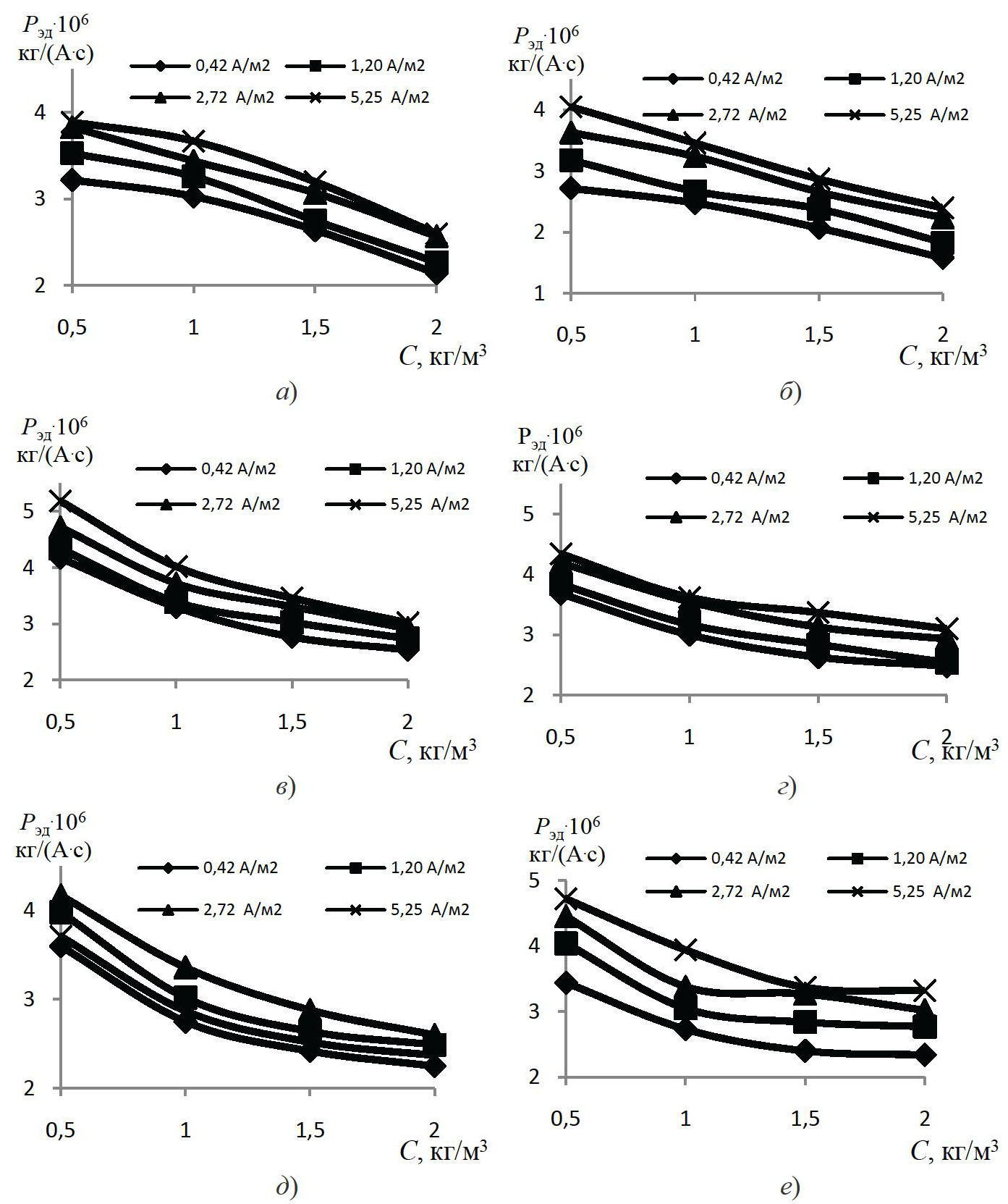 Рис. 4. Зависимости коэффициента электродиффузионной проницаемости мембран МГА-95П (а, б), ОПМ-К (в, г), ОПМН-К (д, е) при Т = 293 K для раствора: а, в, д – никеля; б, г, е – железа