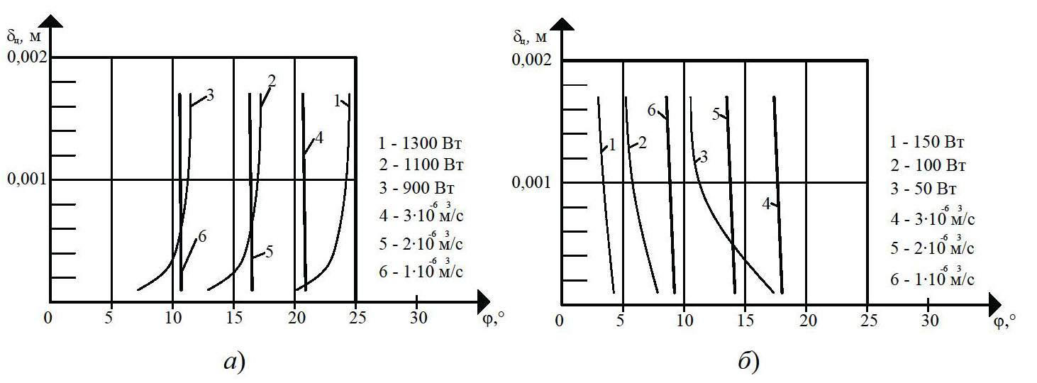 Критерий подвулканизации JB в большей степени зависит от зазора dц, чем от угла наклона нарезки j при изотермическом режиме экструзии (см. рис. 10, а). Причем, чем больше зазор dц (на 100 %) в области реальных значений угла наклона нарезки j, тем меньше критерий подвулканизации JB (на 66 %), что связано с уменьшением времени пребывания резиновой смеси в материальном цилиндре за счет большей производительности Q. Критерий подвулканизации JB практически не зависит от зазора dц, а в большей степени зависит от угла наклона нарезки j при неизотермическом режиме экструзии (см. рис. 10, б), что связано с малой величиной потока утечки в зазоре dц.