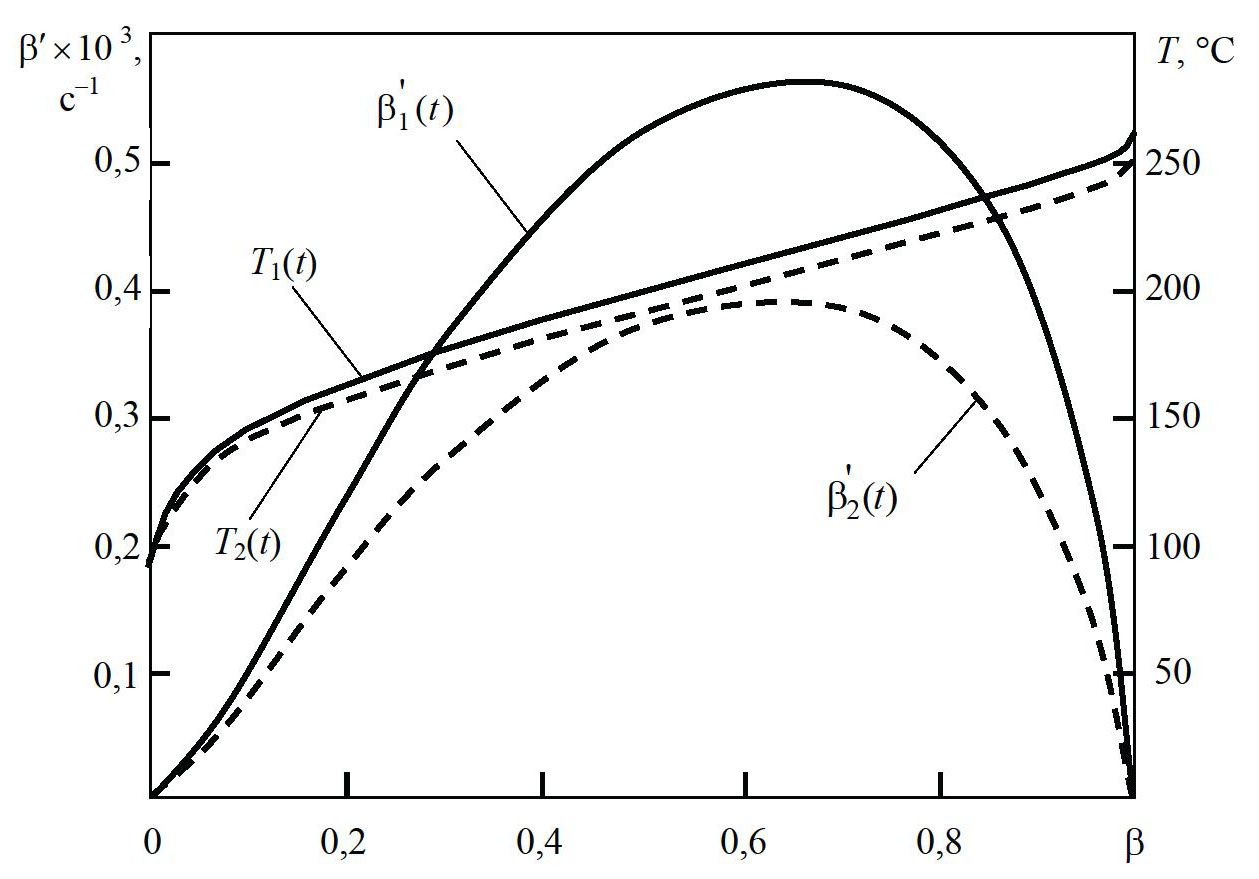 Здесь скорость повышения температуры T1(t) во время максимума W1(t) составляет 3,23 K/мин, скорость повышения температуры T2(t) во время максимума W2(t) – 2,23 K/мин, то есть отношение скоростей нагрева составило 1,45, а отношение максимумов мощностей тепловыделений W2/W1 – 1,43.