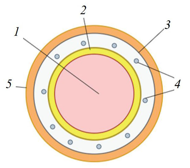 Рис. 1. Схематическая структура гранулированного многослойного органоминерального биоудобрения, обладающего пролонгированным действием: 1 – ядро из сложного NPK-удобрения; 2 – слой покрытия, обеспечивающий пролонгированный эффект действия минеральной составляющей удобрения (постепенное высвобождение NPK в течение жизненного цикла растения) и отрицательный таксис микроорганизмов; 3 – слой покрытия в виде органического субстрата для инкапсулированных в нем микроорганизмов; 4 – микроорганизмы Bacillus subtilis, инокулированные на крахмале; 5 – защитный гидрофобный слой, обеспечивающий положительный таксис микроорганизмов