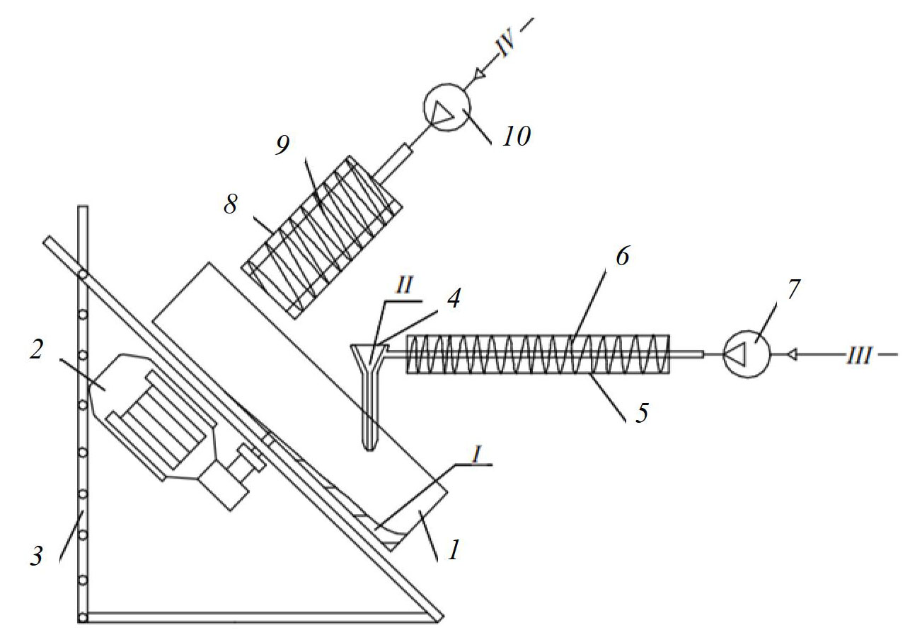 Рис. 2. Условная схема экспериментальной установки для отработки технологии получения гранулированного многослойного органоминерального биоудобрения, обладающего пролонгированным действием: 1 – тарельчатый гранулятор; 2 – червячный мотор-редуктор; 3 – устройство регулировки угла наклона гранулятора; 4 – диспергирующее устройство; 5 – воздуховод с кожухом; 6, 9 – ТЭНы; 7, 10 – компрессоры; 8 – тепловая пушка; I – сырье; II – расплав покрытия; III, IV – воздух