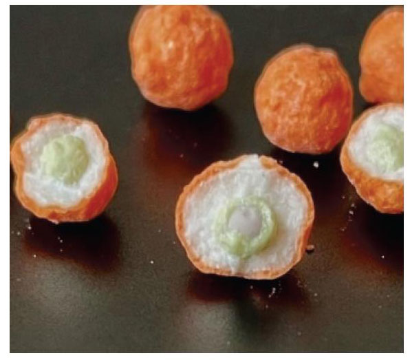 Внешний вид и разрез полученного продукта показаны на рис. 4. Гранулы не имеют видимых сколов и разрушений оболочки, их диаметр составляет 4…5 мм. При измерении статической прочности на приборе ИПГ-1М по ГОСТ 21560.2–82 [10] средняя прочность гранул составляет 15,4 Н.