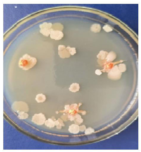 Лабораторные микробиологические испытания многослойных гранул (рис. 5) показали, что при применении представленного способа для их получения, количество жизнеспособных микроорганизмов составляет порядка 1,0·107 КОЕ/г. На рисунке видны остатки копулирующей оболочки, а также растущие на крахмале колонии микроорганизмов. Расчет показывает, что при внесении многослойного удобрения в почву в дозировке 100 кг/га микробная нагрузка будет равна 1,0·1012 КОЕ/га.