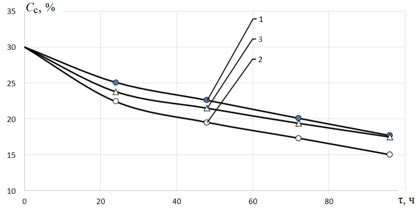 Рис. 4. Кривые изменения концентрации целлюлозы в процессе твердофазной биоконверсии целлюлозосодержащего сырья при различном фракционном составе частиц твердого субстрата: 1 – 0…1 мм; 2 – 1…3 мм; 3 – 3…5 мм