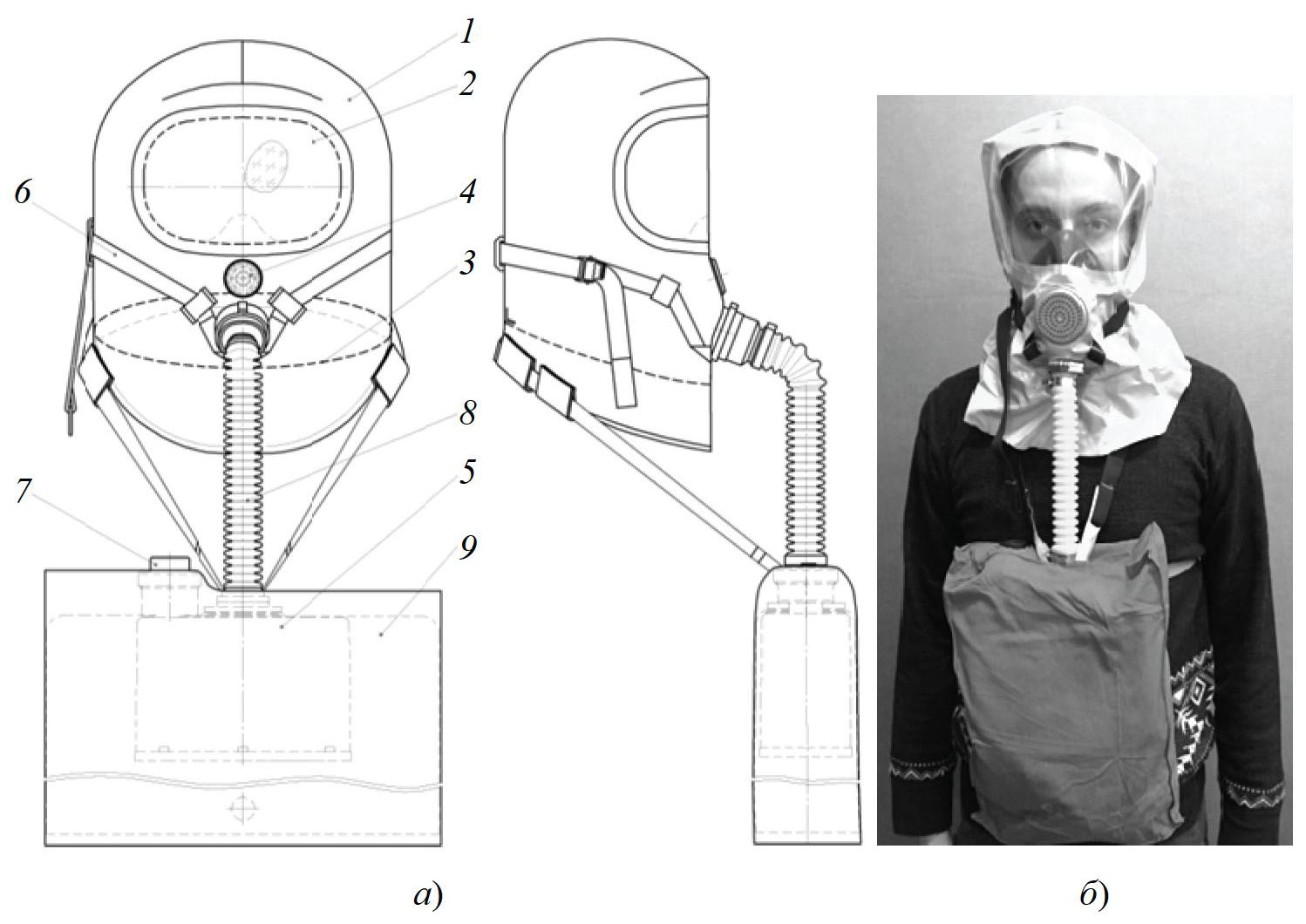 Рис. 1. Схема (а) и внешний вид (б) дымозащитного капюшона