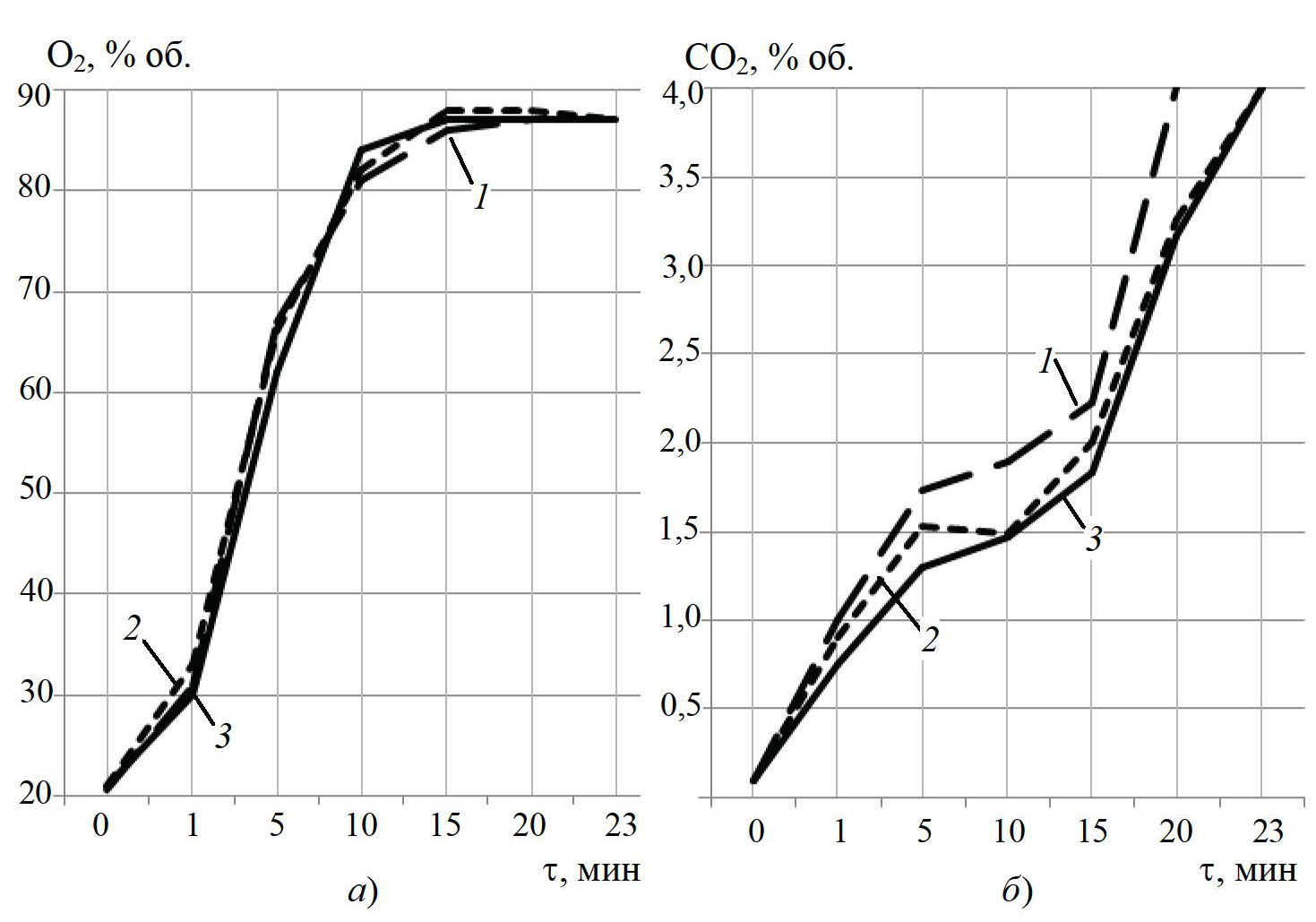 Рис. 2. Зависимость объемной доли кислорода (а) и углекислого газа (б) на вдохе от времени при температурах, °С: 1 – +55; 2 – +24; 3 – минус 15