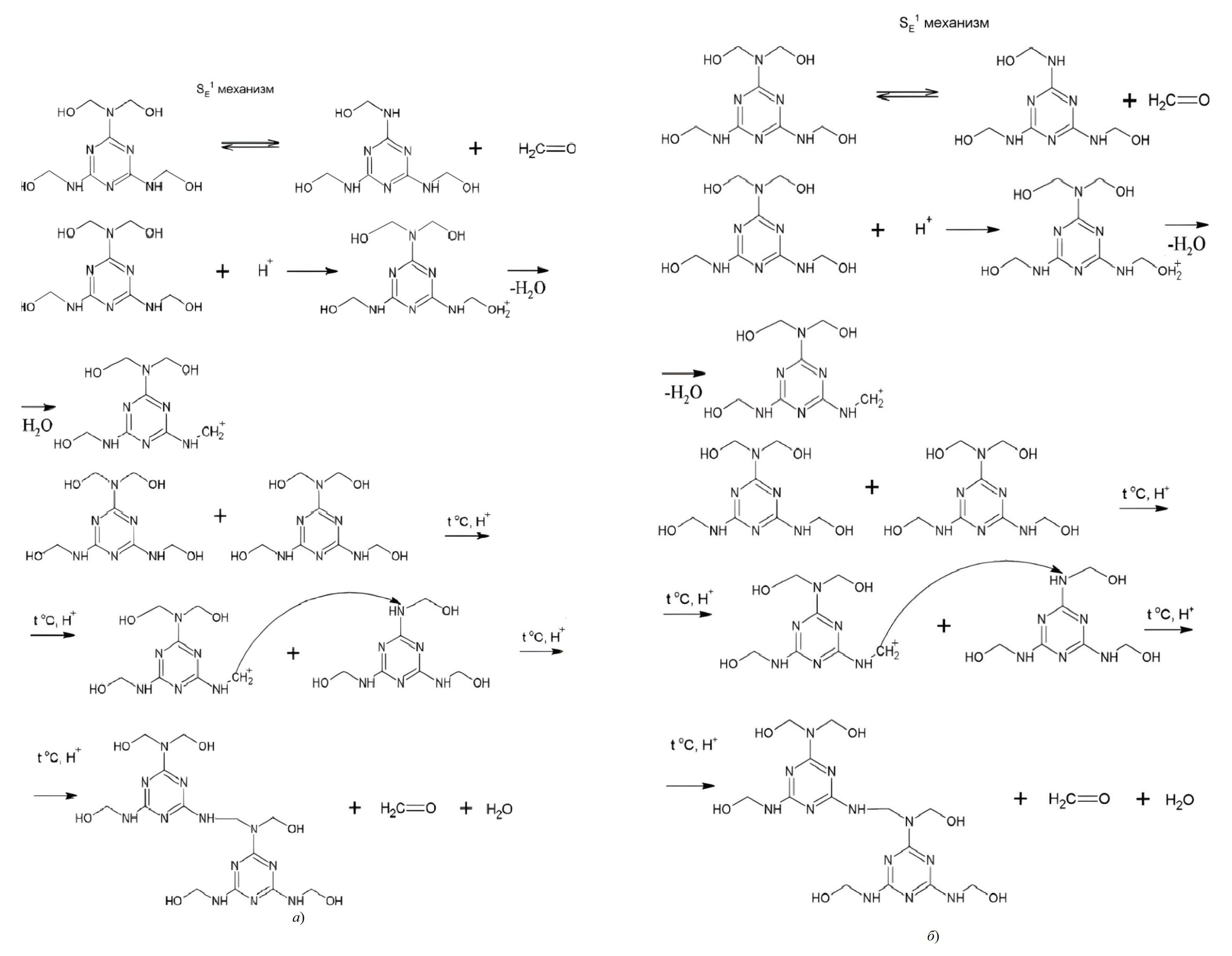 Предположительный механизм реакций поликонденсации олигомеров представлен на рис. 3, а, б [15 – 18].