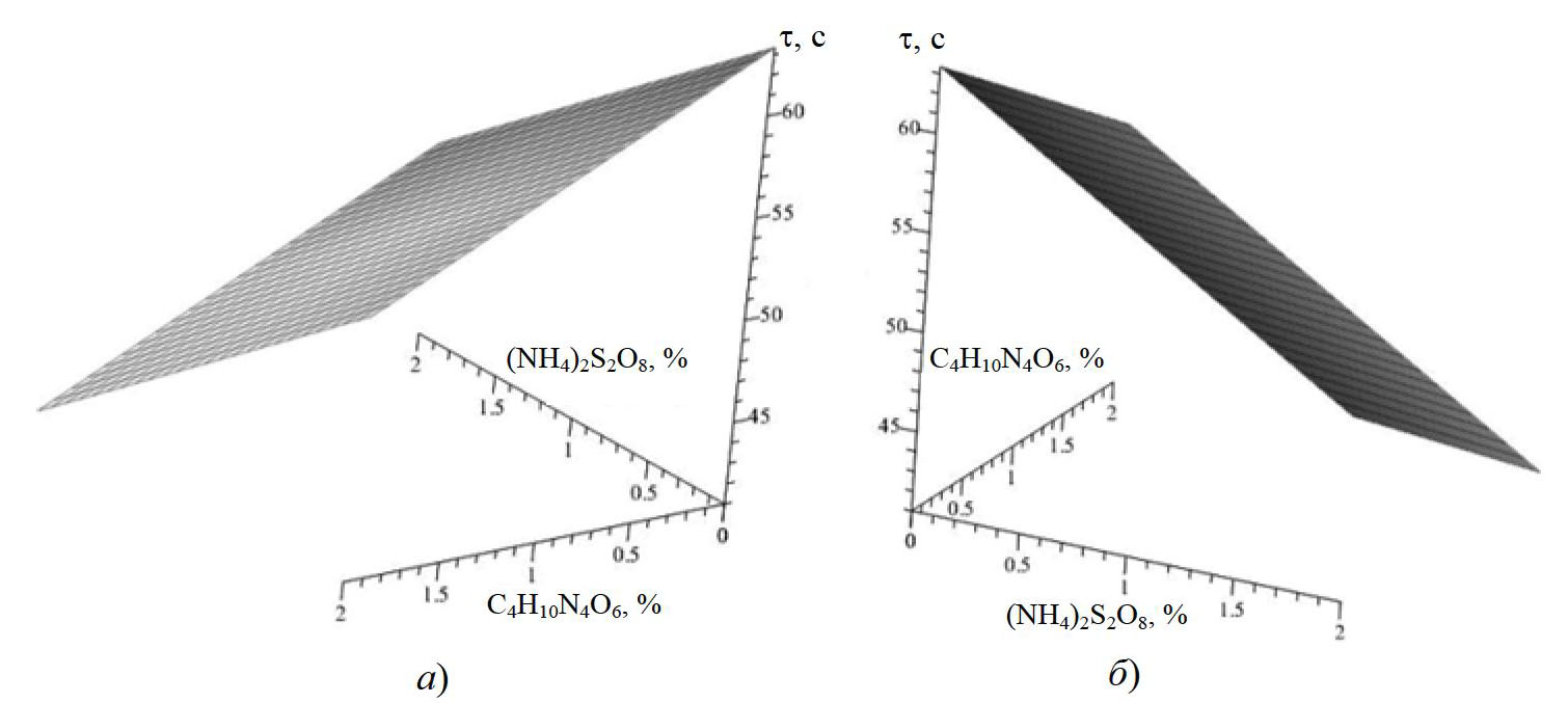 Исследования проводились по методике полного двухфакторного двухуровневого эксперимента 22 [19, 20]. После получения данных проведен глубокий регрессионный анализ, и получена зависимость времени желатинизации от влияния двух факторов (веществ). Анализ экспериментальных данных, представленных в табл. 1, и расчет проводились с использованием программной среды Maple 14 [21]. Графики зависимостей времени желатинизации от концентраций компонентов представлены на рис. 4. Зависимости точно отражают реальный процесс, что подтверждается рассчитанным значением критерия Фишера, стандартное отклонение составляет 1,29. Проведя оценку значимости коэффициентов регрессии, сделаны выводы, что коэффициент, который характеризует взаимное влияние факторов (концентраций веществ) свойства продукта, незначителен. Следовательно, добавки действуют независимо друг от друга, и усиления или ослабления действия веществ по суперпозиционному или синергетическому закону не происходит.
