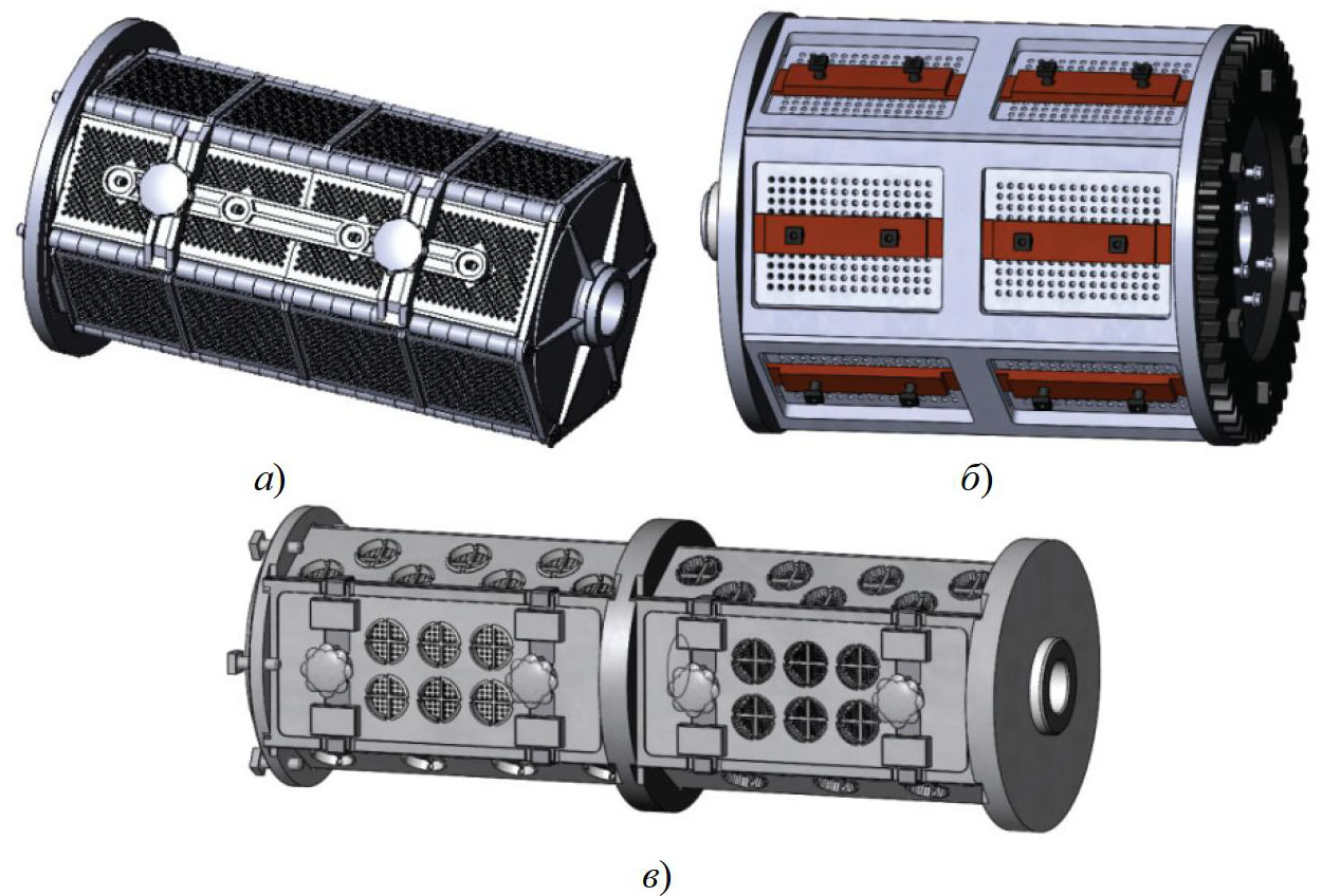 Рис. 1. Погружные гальванические барабаны под прямоугольную и круглую перфорации (а, б) и под цилиндрические фильеры (в)