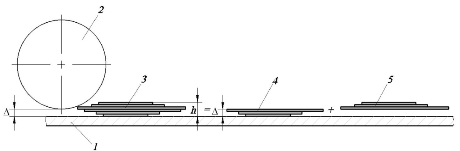 Рис. 1. Схема механизма эксфолиации: 1 – обечайка барабана; 2 – стержень; 3 – исходная частица; 4 , 5 – часть частицы, которая соответственно прошла и не прошла через зазор