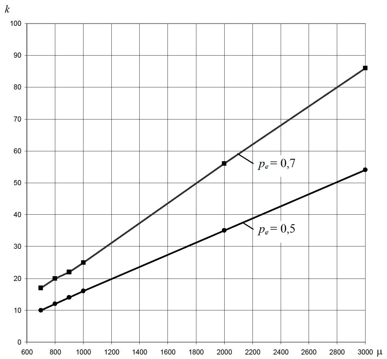 В первой серии численных экспериментов исследовали влияние р(е) на кинетику процесса и использовали следующие данные: интервал распределения исходных частиц 0…4000 нм; исходное распределение по фракциям соответствует параметрам плотности нормального распределения μ = 3000, σ = 200; зазор соответствует номеру фракции 30, где среднее распределения f [30] = 2900…3000 нм. На рисунке 4 показана зависимость числа переходов k, которые необходимо совершить для того, чтобы более 60 % массы частиц оказались в первой фракции, то есть имели размер от 0 до 100 нм.