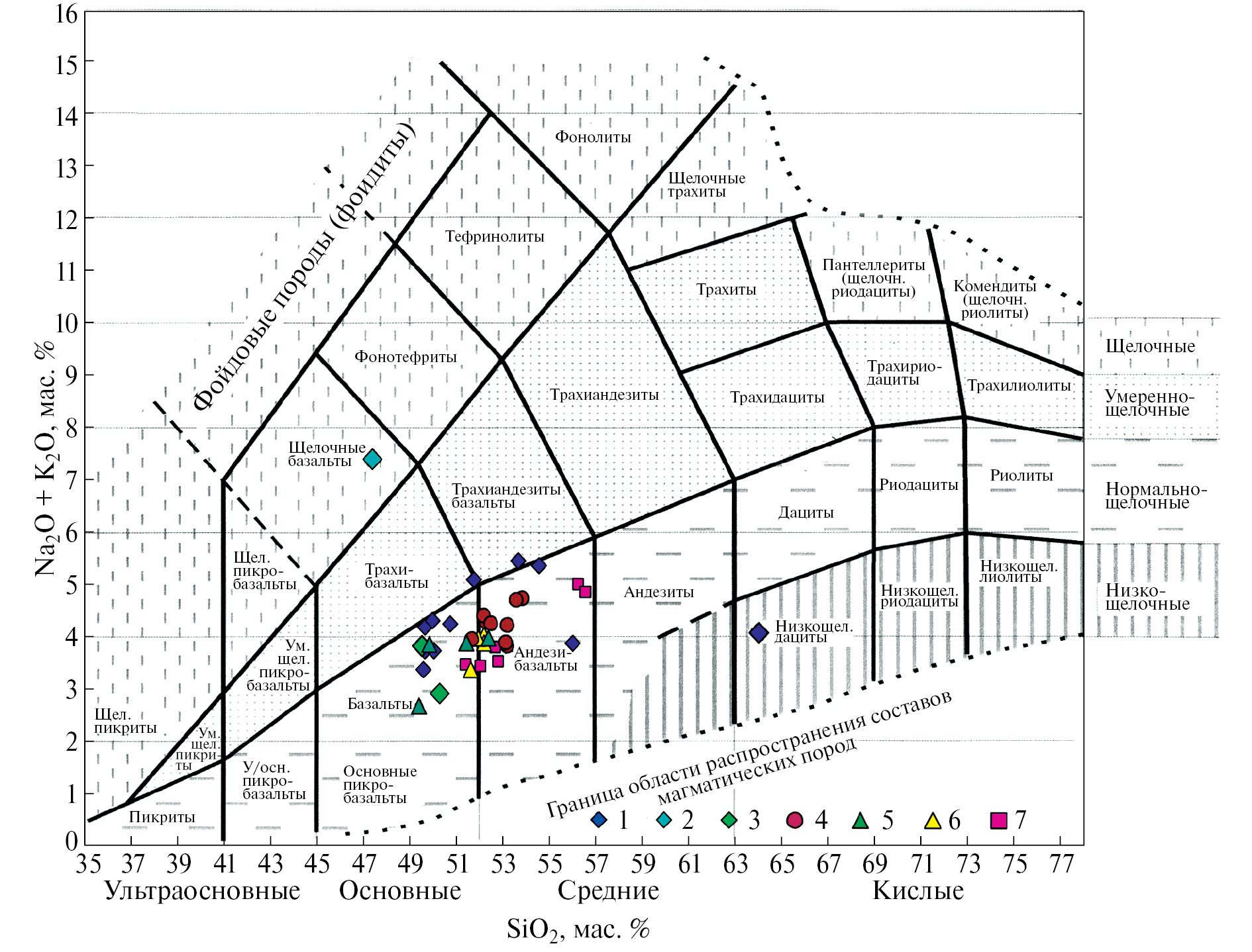 В работе [Stern, Bibee, 1984] представлены конкретные химические анализы этих же образцов, и установлено, что в прикратерной зоне опробованы базальты, а на западном склоне – андезибазальты и базальты.