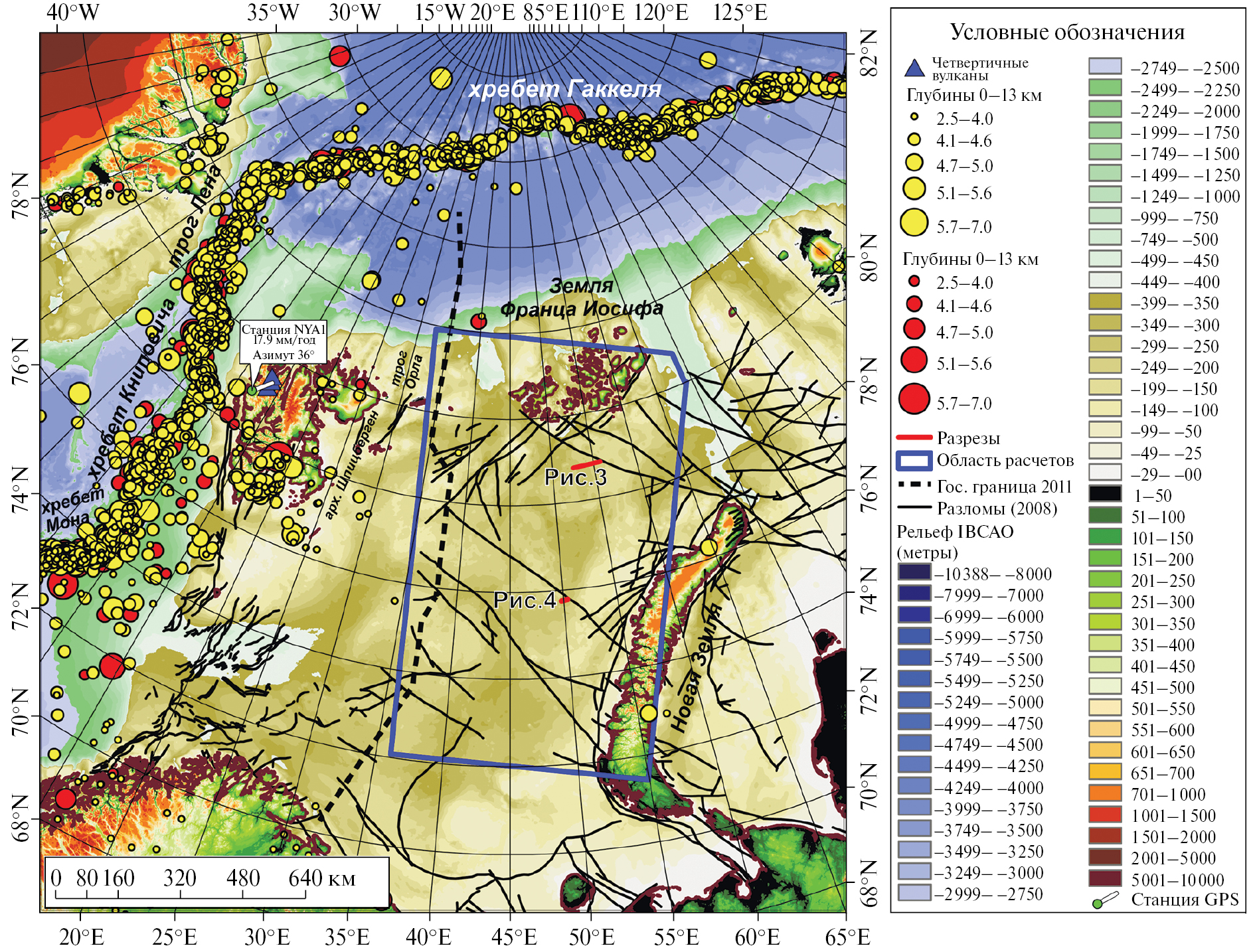 Рис. 1. Сейсмичность северо-западного обрамления шельфа Баренцева моря по данным (USGS, 2022) для событий с магнитудой >2.5 раздельно для интервалов глубин 0‒13 и 13‒40 км, разломная сеть по данным [Harrison et al., 2008], четвертичные вулканы по данным [Сироткин, Шарин, 2000] и параметры движения станции GPS NYA1 по данным [Heflin et al., 2020; GPS …, 2022]. Показаны: область расчетов пространственно-временной эволюции суммарного момента слабых сейсмических событий по данным [NORSAR..., 2022] за период 2001‒2020 гг. (синий прямоугольник) и положение фрагментов разрезов (красные линии). Топоснова приведена по данным IBCAO [Jakobsson et al., 2020].