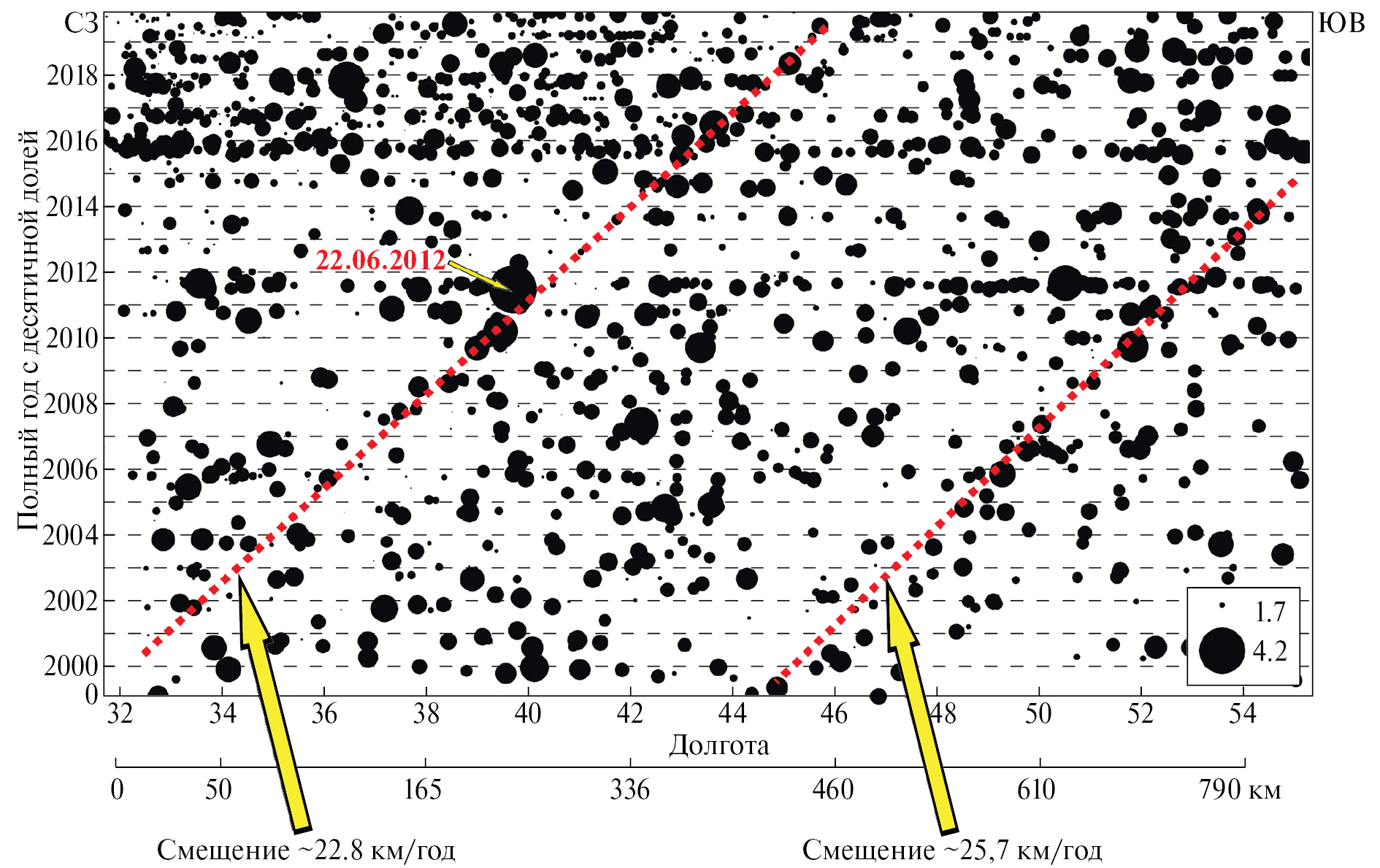 Рис. 7. Пространственно-временная структура сейсмичности по данным [NORSAR …, 2022] вдоль области анализа (см. рис. 6) в полосе около разлома с линейным группированием эпицентров. Горизонтальная шкала долгот дополнена расстоянием вдоль области в километрах. Стрелками и цифрами указаны линии трендов и скорости смещения энерговыделения вдоль них.