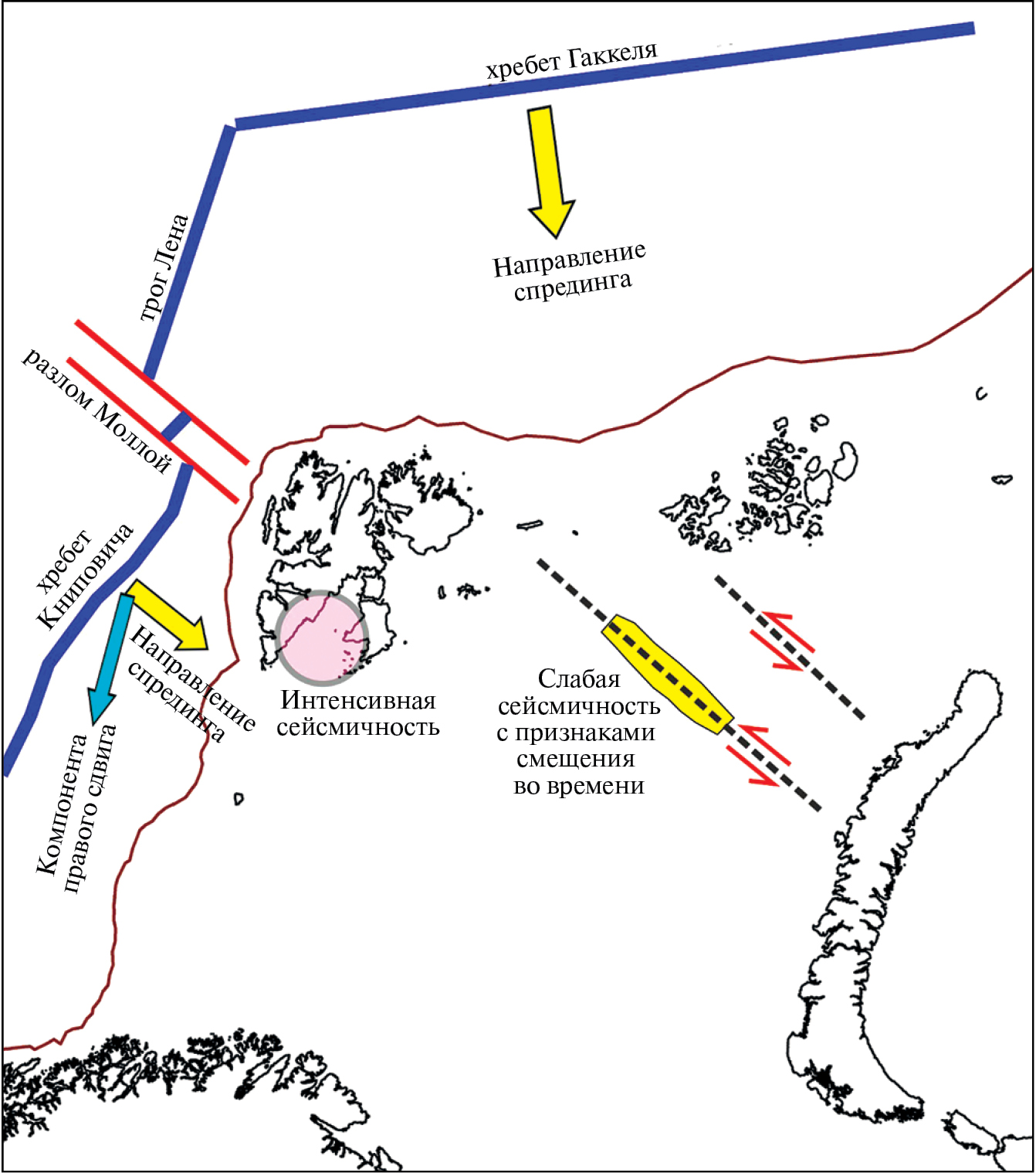 Работа выполнена при поддержке Проекта РНФ № 22-27-00578 “Новейшая и современная геодинамика Западной Арктики: эволюция и воздействие активных тектонических процессов на структурные элементы и осадочный чехол глубоководных котловин и шельфов”.
