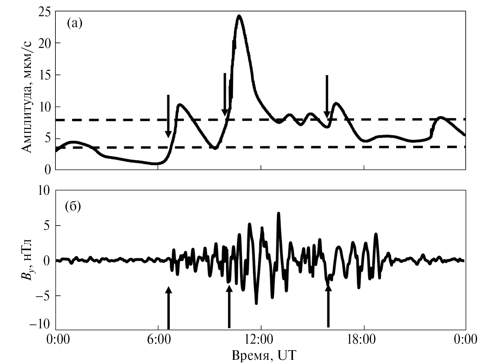 Рис. 1. График вулканического дрожания Стромболи (запись вверх‒вниз) за 09.10.2022 г., адаптированный из данных, представленных на сайте [http://www.ct.ingv.it/] (а); вариации геомагнитного поля на станции “Гальяно” за 09.10.2022 г. (б); стрелками обозначены начала высоких значений вулканического дрожания.