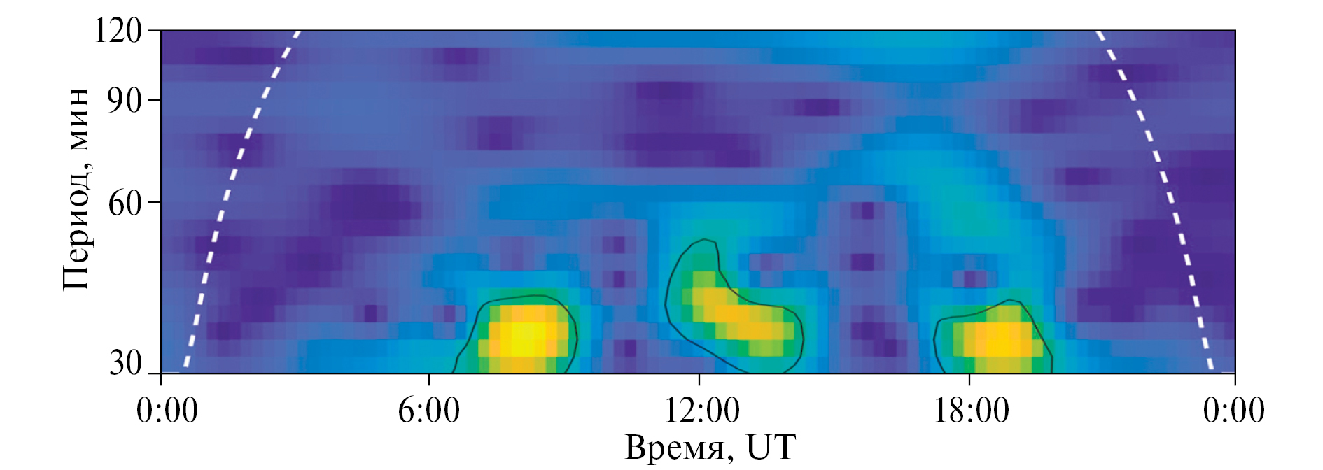 В дополнение к анализу временных вариаций критической частоты F2-слоя был выполнен спектральный анализ на основе вейвлет-преобразования. В качестве примера на рис. 7 приведены результаты вейвлет-анализа в виде оценки локального спектра энергии – скалограммы. Из рис. 7 видно, что отмеченные выше аномалии, связанные с вулканической активностью Стромболи, проявляются в диапазоне частот 30−50 мин. Здесь следует отметить, что более детальную информацию невозможно получить из-за 15-минутного режима зондирования ионосферы.