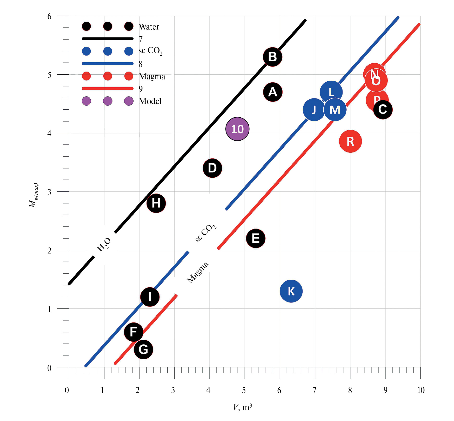 Важным следствием из анализа распределения опытных данных, показанных на рис. 1, является то, что значения максимальных магнитуд триггерной сейсмичности не превысили теоретически обоснованного предела для воды (уравнение 7) и экспериментально установили предел для суперкритического СО2 (уравнение 8) и магмы (уравнение 9).