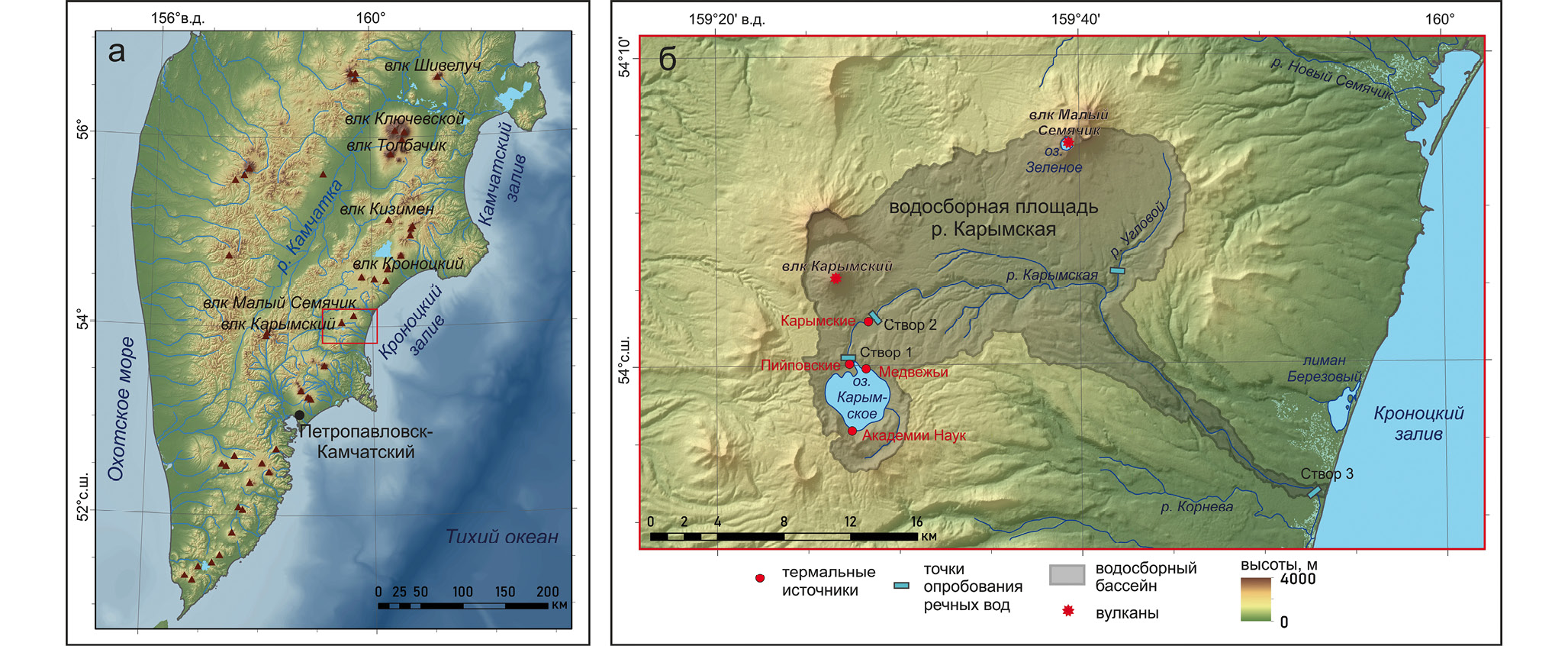 Карымский вулканический центр (КВЦ), расположенный в центральной части восточного побережья Камчатки на берегу Кроноцкого залива (рис. 1а), – один из наиболее ярких примеров, где в полной мере можно оценить последствия влияния как вулканической, так и гидротермальной деятельности на речной сток.
